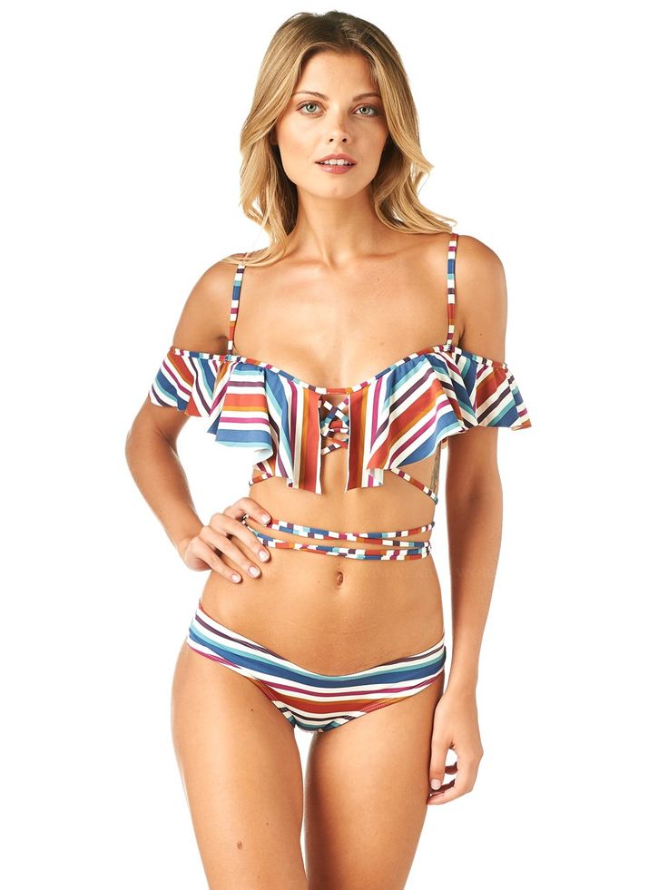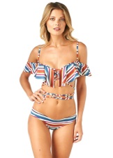 Girls with narrow shoulders as compared to hips or a “triangle” figure should choose swimsuits with a tie at the neck. This technique will visually make the shoulders wider. If the upper part can be additionally loaded with a combination of colors and decorative elements, then the bottom of the swimsuit for such a figure should be calm. All this helps to balance the upper and lower body. A good option would be a swimwear planj or halter.