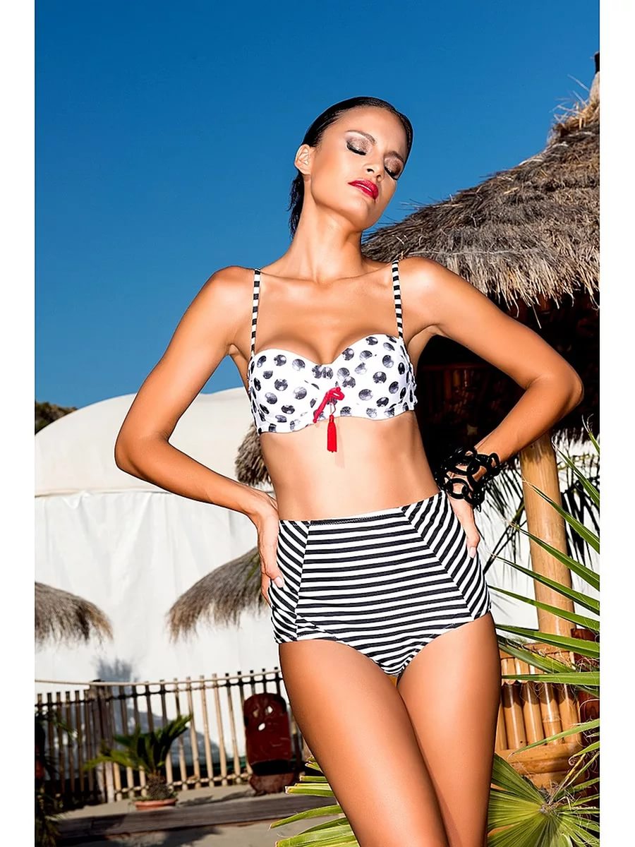 The magnificent one-piece swimsuit is made in the classic combination of white and black. It is decorated with an unsurpassed geometric print. This swimsuit is suitable for women with an imperfect figure. It will help to hide the extra centimeters at the waist, emphasize the beautiful shape of the chest.
