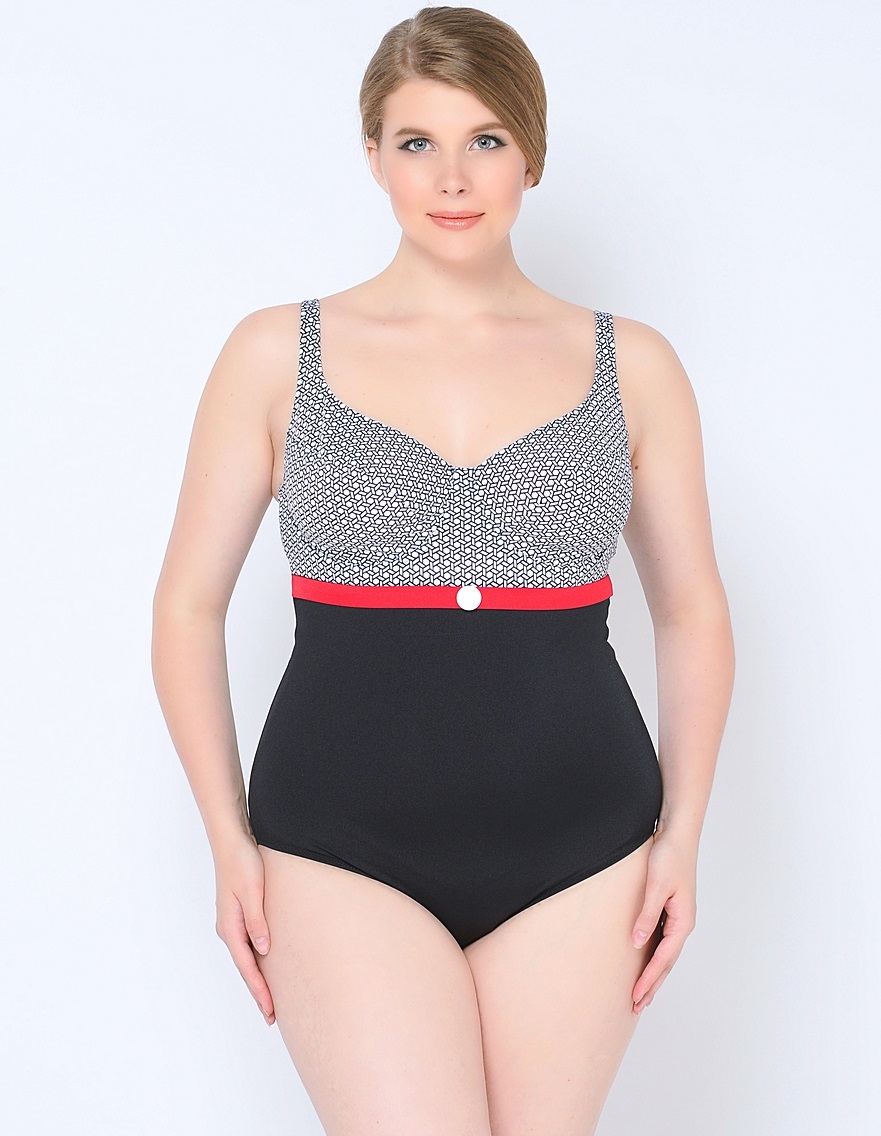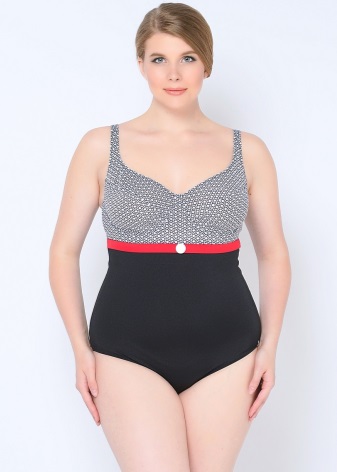 - Contrast swimsuits with peas are perfect for full ladies;