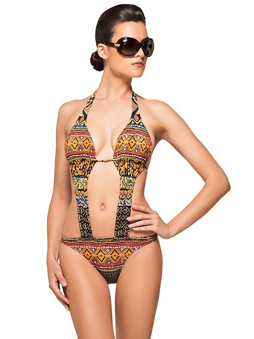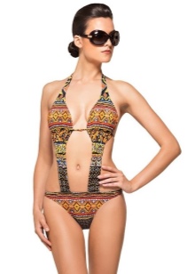 This style is perfect and is a real find for slender natures with perfect body proportions. The appearance of the swimsuit behind does not differ from the separate models. The front of the bodice connects to the melting with a vertical stripe. It can be of different widths: often the front part of the product resembles a one-piece swimsuit with cutouts on the sides. Typically, this style has thin straps on the bodice and strings of medium width on swimming trunks.