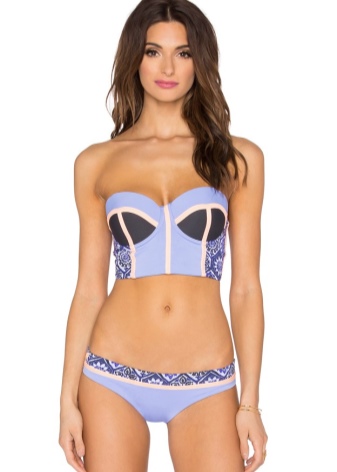 - A very non-standard solution is the bustier swimsuit, the upper part of which can have a classic or slightly elongated style. The model of the bustier is characterized by an elongated model of the bodice, slightly covering the ribs or reaching the level of the umbilical cord.