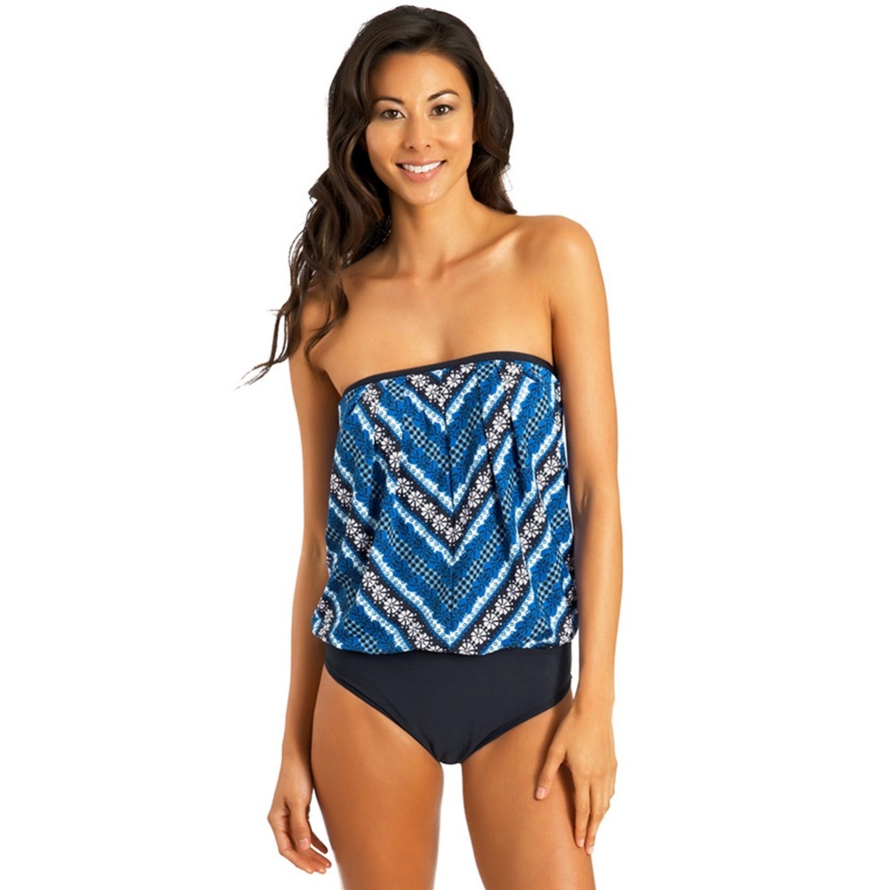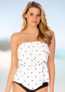 Tankini is divided into tops with straps (Kamkini) and without straps (bandokini). Panties tankini can have a different style (shorts, thongs, melts with high and low seating). The upper part may look like a regular top or be supplemented with or without underwired cups.