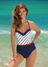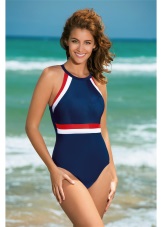 Sports models of swimsuits are made in the traditional colors: blue, white, black and red. As decorations used contrasting color stripes.