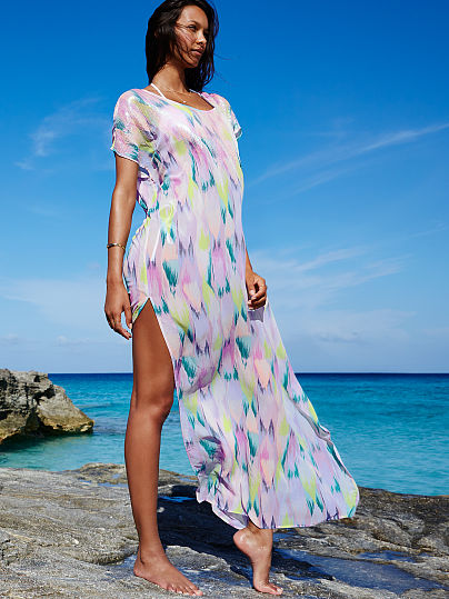 - Not less popular are chiffon capes. The color scheme of the presented models is quite diverse, which allows you to choose the outfit in accordance with the color of the swimsuit. Bright prints and ornaments that decorate such capes will make a feminine image original and memorable. These capes often have a belt at the waist for ease of fixation, there are models with a deep line of neckline that is worn over the head. Capes of chiffon are distinguished by their practicality: they do not need to be ironed, and they also dry rather quickly.