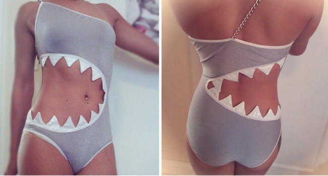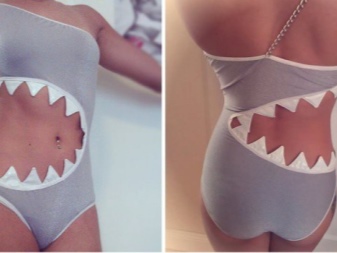 Bold and impudent women of fashion love spectacular dresses with aggressive prints. Very popular are "dangerous" swimsuits with the image of the attacking shark. For ladies who want something more, designers produce original monokini, in which the edges of the cutouts are complemented by huge shark teeth.