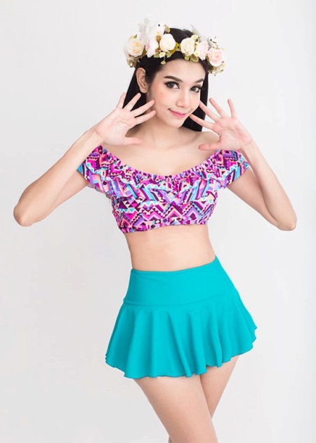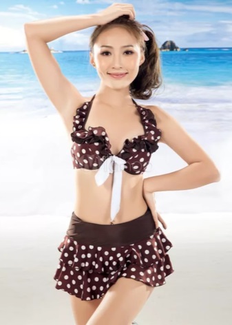 Swimsuits with a skirt will look good on girls with wide hips, or on owners of narrow hips and a magnificent bust. In this case, he will help balance the figure by selling the missing volume to the bottom. Choose a full skirt with ruffles and other decorative elements that will look flirty and cute.