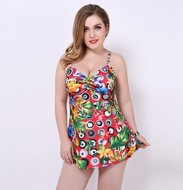 - Elegant red polka dot swimsuit, made in retro style, which will hide all the problematic places on the pear and hourglass figure. Wide straps serve as reliable support for the bust, a fitted skirt emphasizes mouth-watering shapes, and a frill at the bottom lends a flirty look to the image. Look complemented by vintage sunglasses.