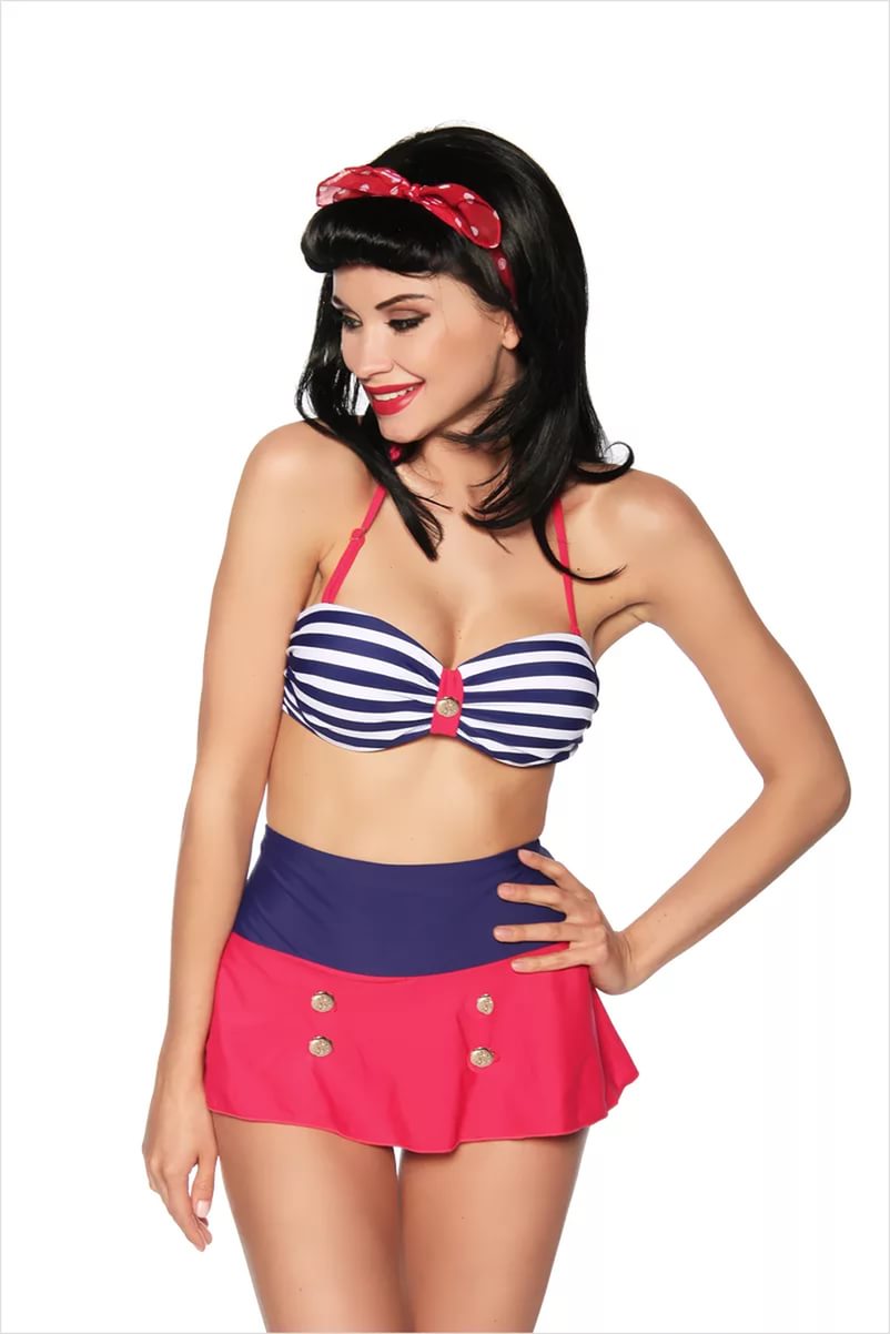 Pin-up swimsuit with a high waist and flirty skirt with ruffles looks very elegant. Such panties emphasize the waist, visually making her slimmer and sleeker. Wide straps on the bodice support the chest well and give a highlight to the image.