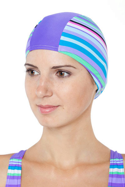 Textile hats are made of the same materials as swimwear - lycra, polyester, polyamide and other synthetics. Their main function is to remove hair. The product does not press on the head, easily put on, does not electrify. But unlike other models, this cap misses the water. Therefore, this option is more appropriate not for swimming, but for water aerobics. Textile models are not terrible hairpins, because a few holes will not change its properties. The price of such a product is low.