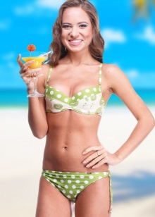 It should be noted that the fused models of green are better to choose with an ornament or an asymmetrical large pattern. Plain green swimsuits will look good if they are decorated with vertical elements, such as large zippers, necklines or fringe.