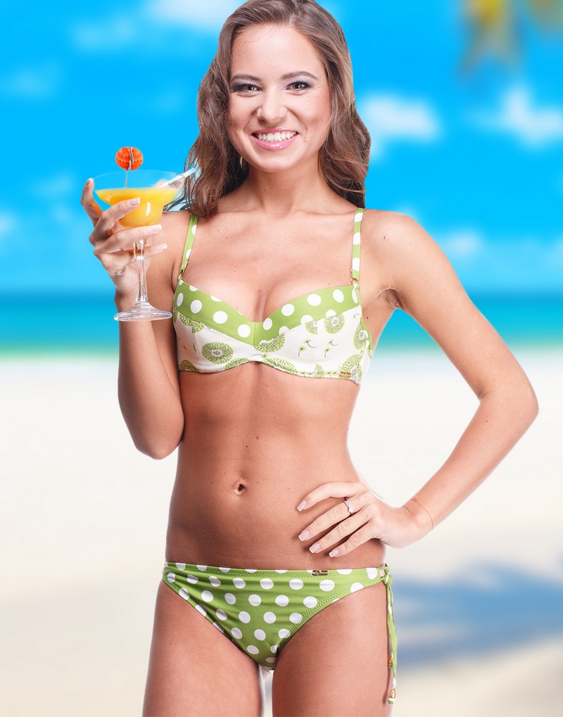 In the fashion are single-colored separate swimsuits, concise or complemented by graceful pleats on the bodice. They are designed to emphasize the richness and beauty of the green color, so they are deprived of lush decor.