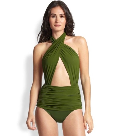 The green color is in perfect harmony not only with the color of tanned leather, but also with gold fittings. Designers decorate green swimsuits massive rings or large chains.