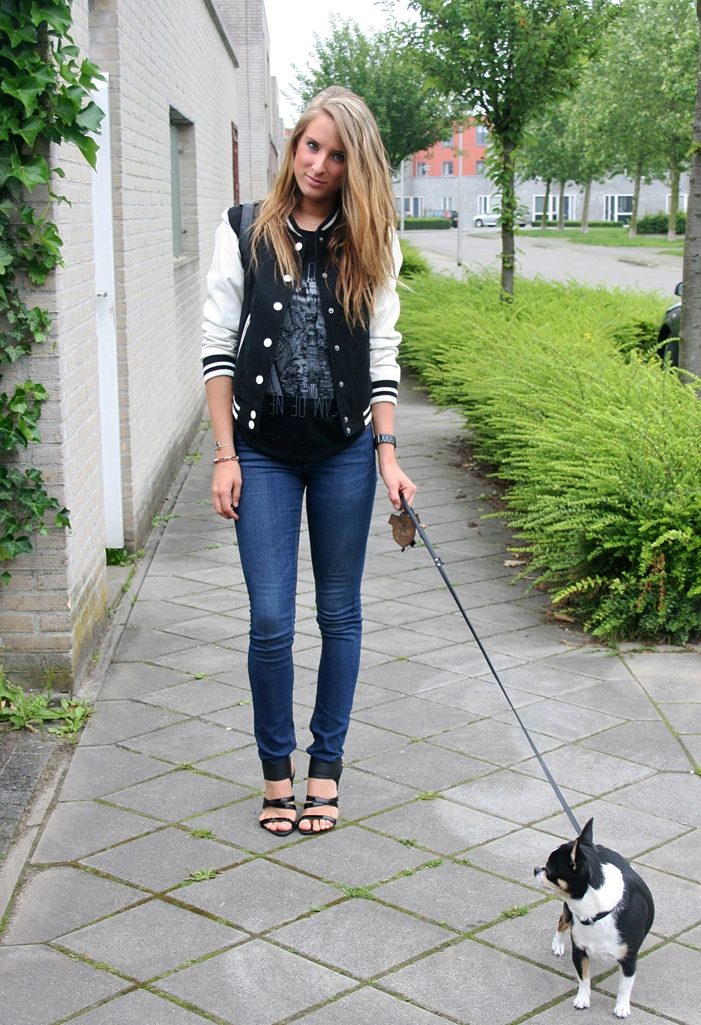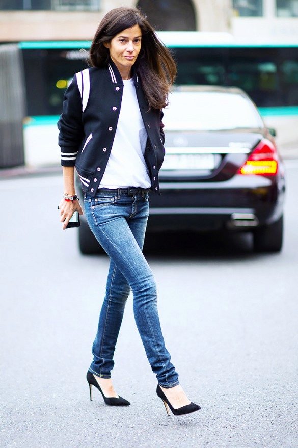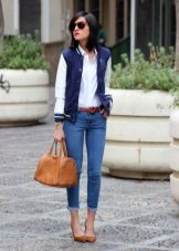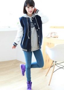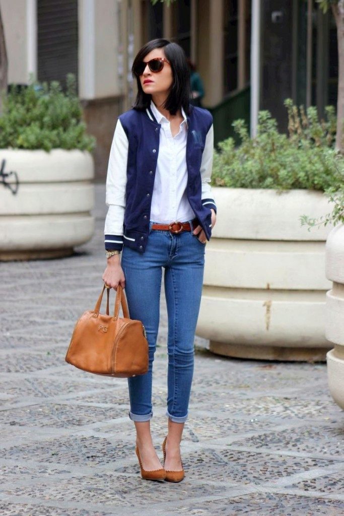 - One of the most frequent images of a baseball jacket is its Combination with jeans, sneakers and a baseball cap. Baseball jacket looks good as a straight cut jeans, and with skinny jeans. To make the image more elegant, you can pick up shoes with heels or ankle boots, and use an elegant bag or a thin bracelet as accessories.