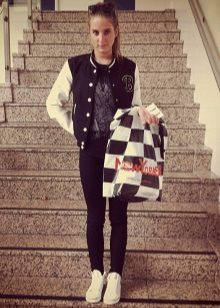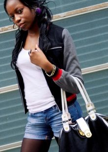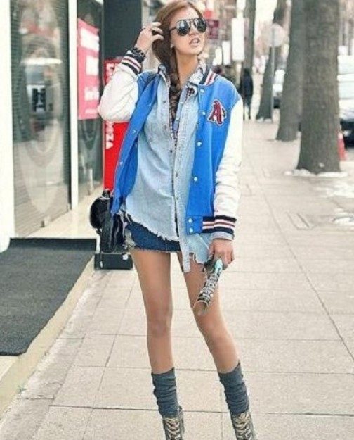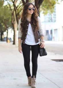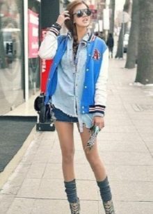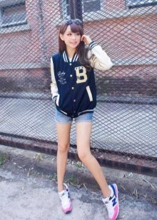 - Youth and a little boldly looks A combination of a baseball jacket and denim or leather shorts. Shoes in this case can serve as half boots or biker boots.