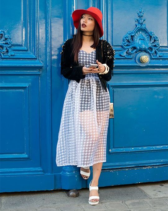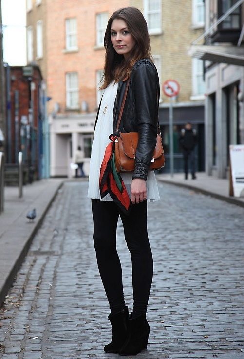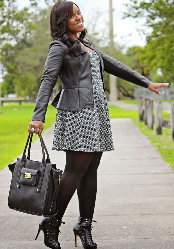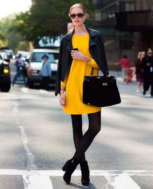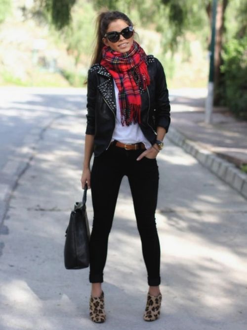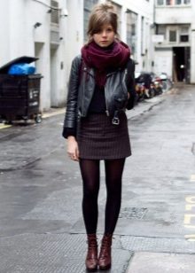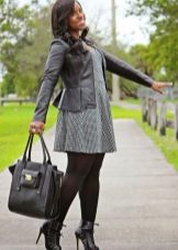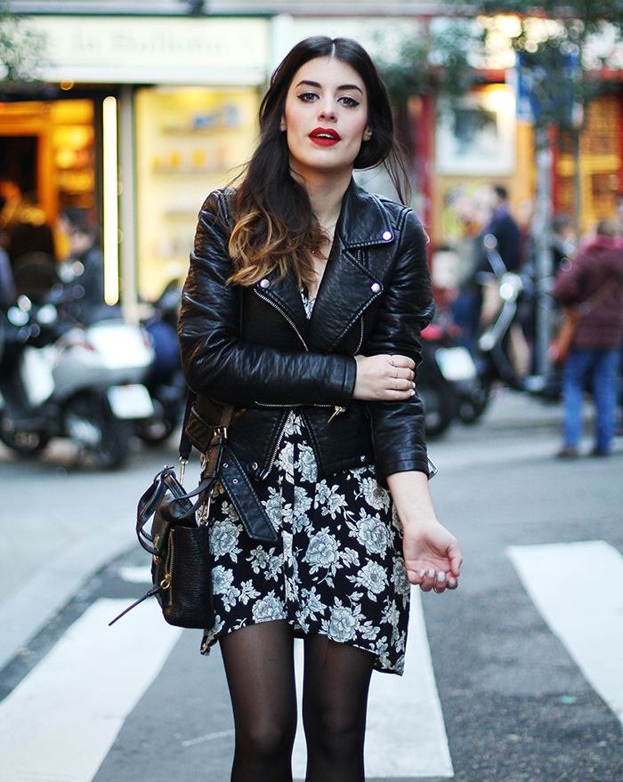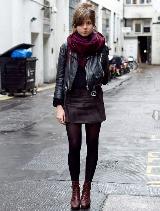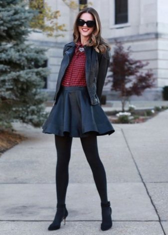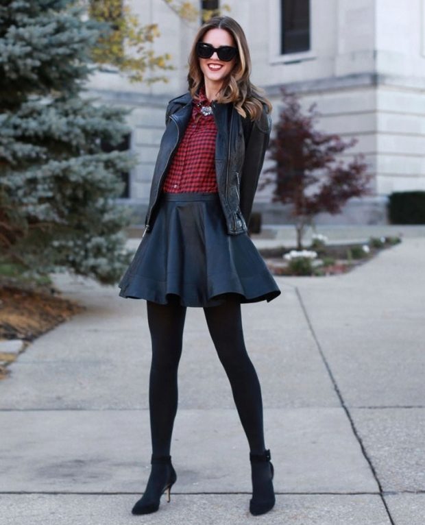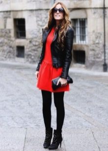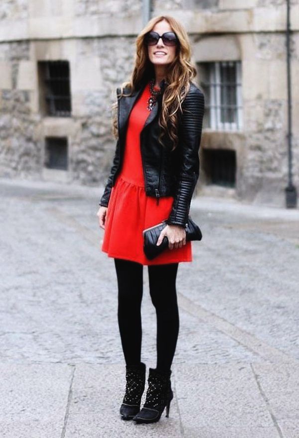 - The classic color combination is always relevant. The red mini dress looks great with a black leather jacket with a slim fit. Black tights, high-heeled boots and an elegant clutch complete the look.