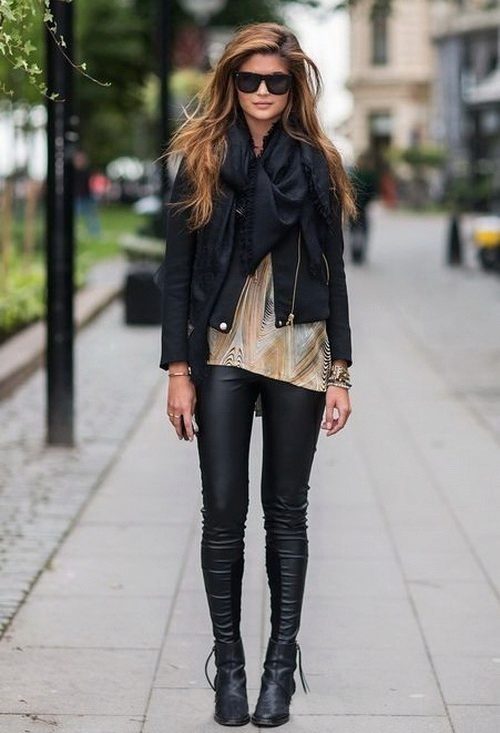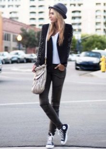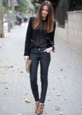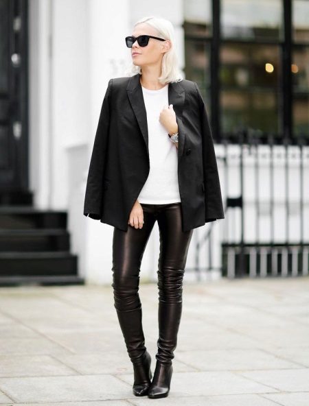 Another youth option: blazer + shiny black leggings. The kit will be complemented by a bright or opposite - white top and sandals or high-heeled shoes in tune to it. Leggings can be completely replaced with skinny jeans of dark shades, and boots with sneakers.