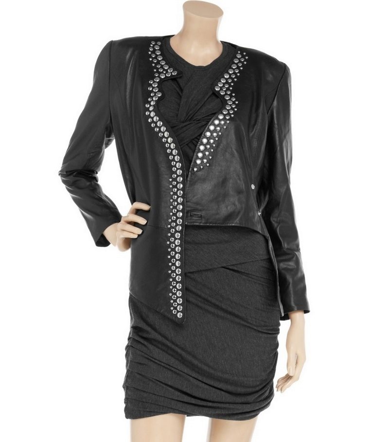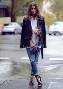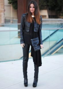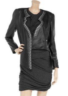 - Lovers of bold, extraordinary images can try on a spectacular leather jacket with an asymmetrical cut with a black knee-length dress. A strict image will dilute the decoration of the jacket in the form of a strip of rhinestones or metal rivets.