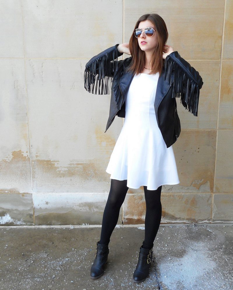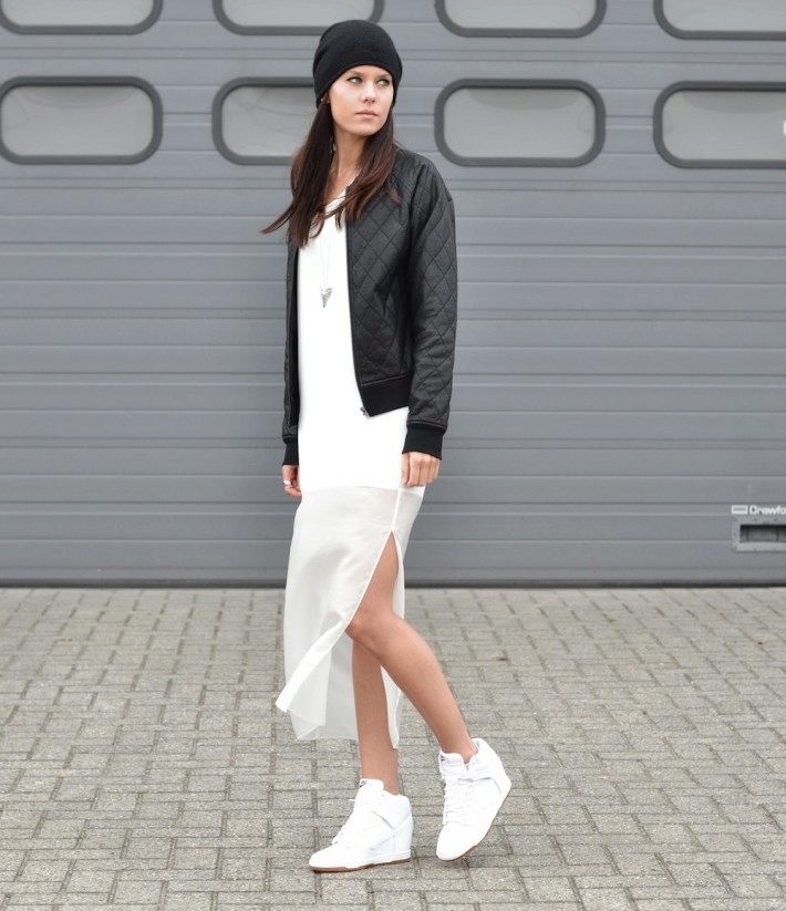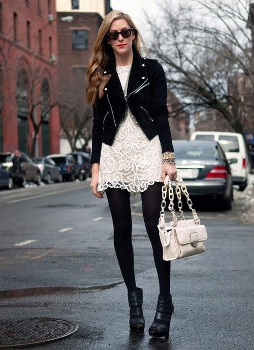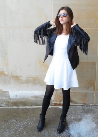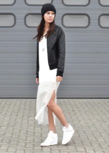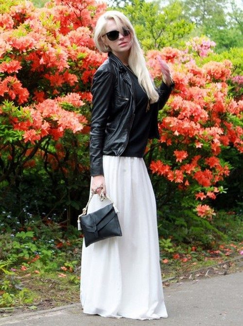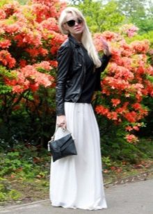 - Another option: a snow-white chiffon dress in the floor + black jacket-biker jacket or bomber jacket. A minimum of jewelry, from accessories - a black handbag.