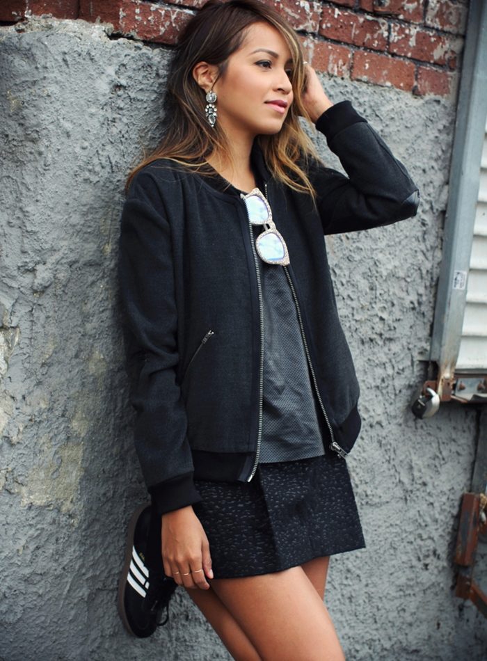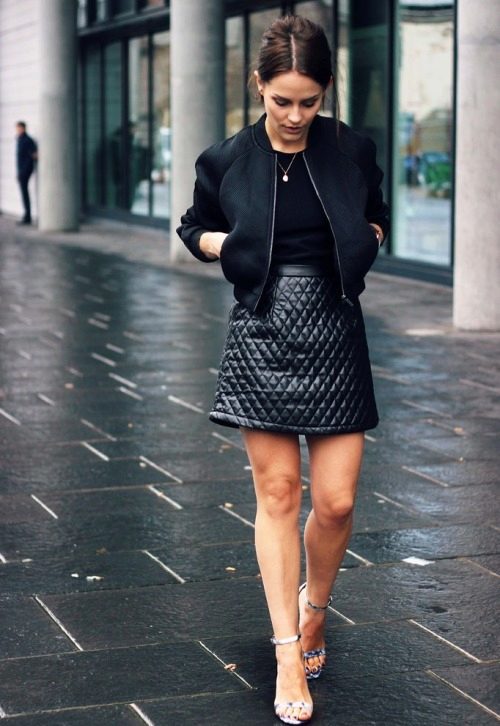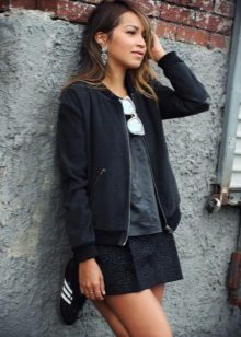 The trend of youth fashion is a black jacket. In order to create a bright, memorable image to such a jacket, you should wear dark-colored tight-fitting jeans, a plain top or tank top and shoes on a high platform. For a more rigorous, businesslike look, a classic-colored sheath dress and high-heeled shoes. For a casual look, skinny jeans in dark blue, white jersey and sneakers are recommended.