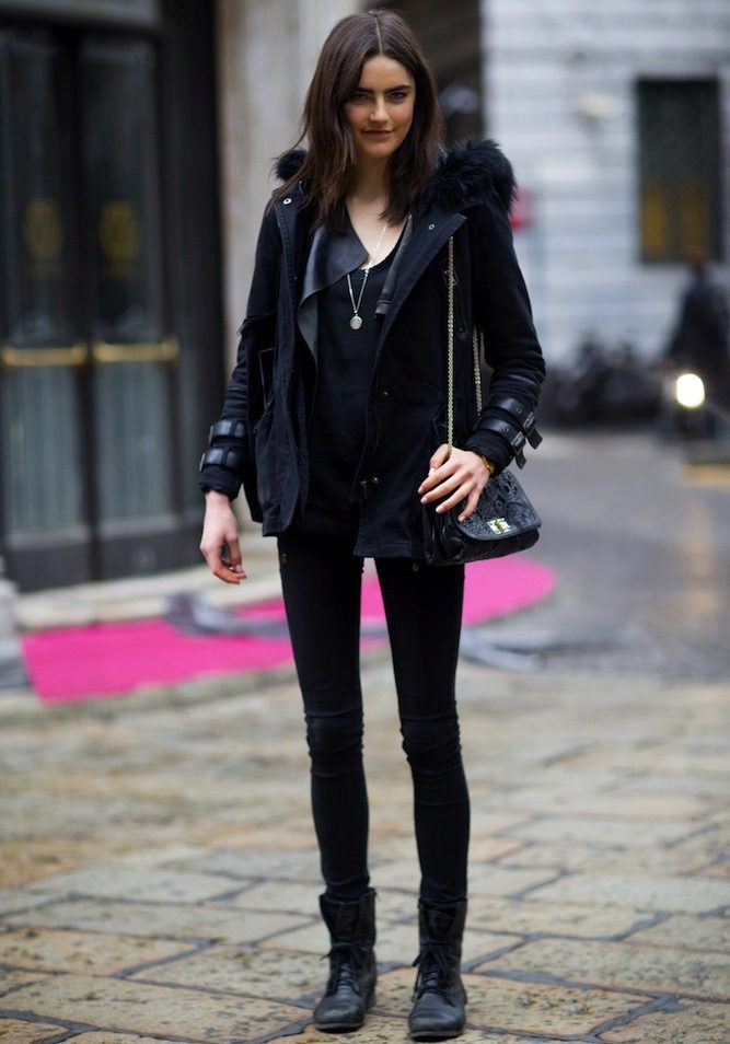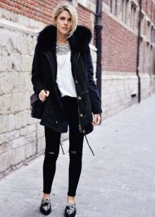 Black parka is a very feminine, elegant option. This jacket is suitable for creating a romantic or classic look. The park goes well with monophonic dresses of rich, bright color, with jeans and leggings.Shoes - classic shoes, ankle boots, boots with heels or uggs.