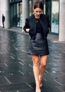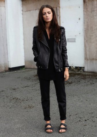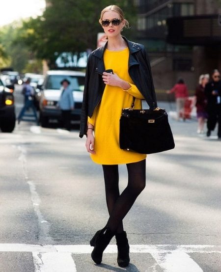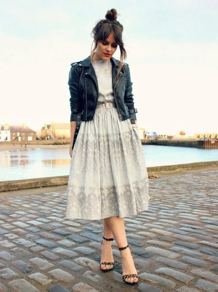 Cropped models of black leather or denim jackets are perfectly combined with dresses and mini skirts with a straight and flared silhouette. The dress can be decorated with a bright, spectacular print or be monophonic, but bright. As a shoe fit, as neat, elegant ballet flats, and shoes with a small heel.