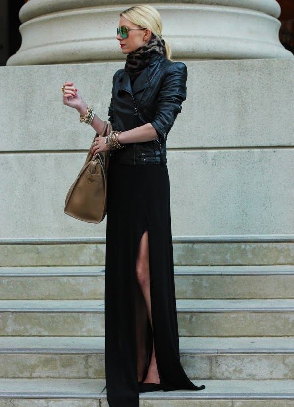 Evening option: a skirt in a floor from elegant fabric of saturated color + a smooth top or a strict blouse + a leather jacket. An elegant clutch bag will effectively complete the created image.