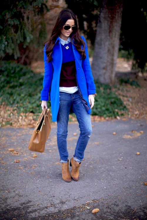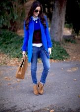 The top, even though it will be under the jacket, needs to be chosen from light fabrics, since under the thin skin of the jacket, the bulk fabric will visually add to you a couple of extra pounds. Shoes should be selected based on your style and overall look. All black and blue shoes go well with a blue jacket - shoes, boats, and ankle boots. Lifting it can be different - and the usual wide heels, and a wedge, and a stud will be appropriate, and their height should be chosen according to the overall style of the image.