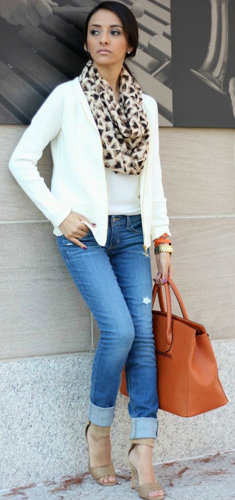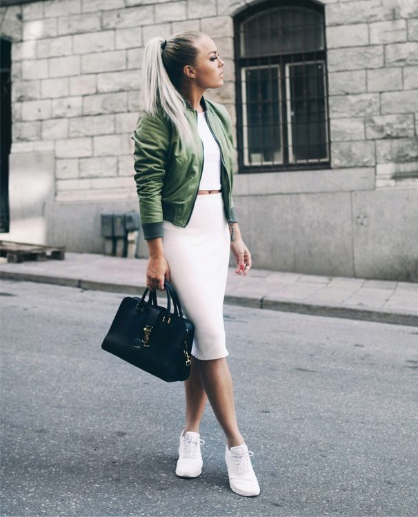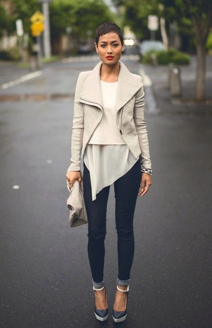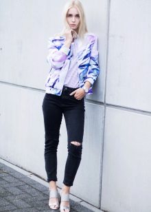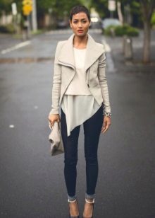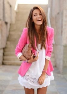 The compatibility of the jacket in white with other colors is simply amazing. You can wear it with strict black trousers and sports pants in bright acidic tones. And the combination of a white jacket with the rest of the white clothes will create a magical airy and transparent look that will leave no one indifferent. It is only important that the styles of things be combined with each other.