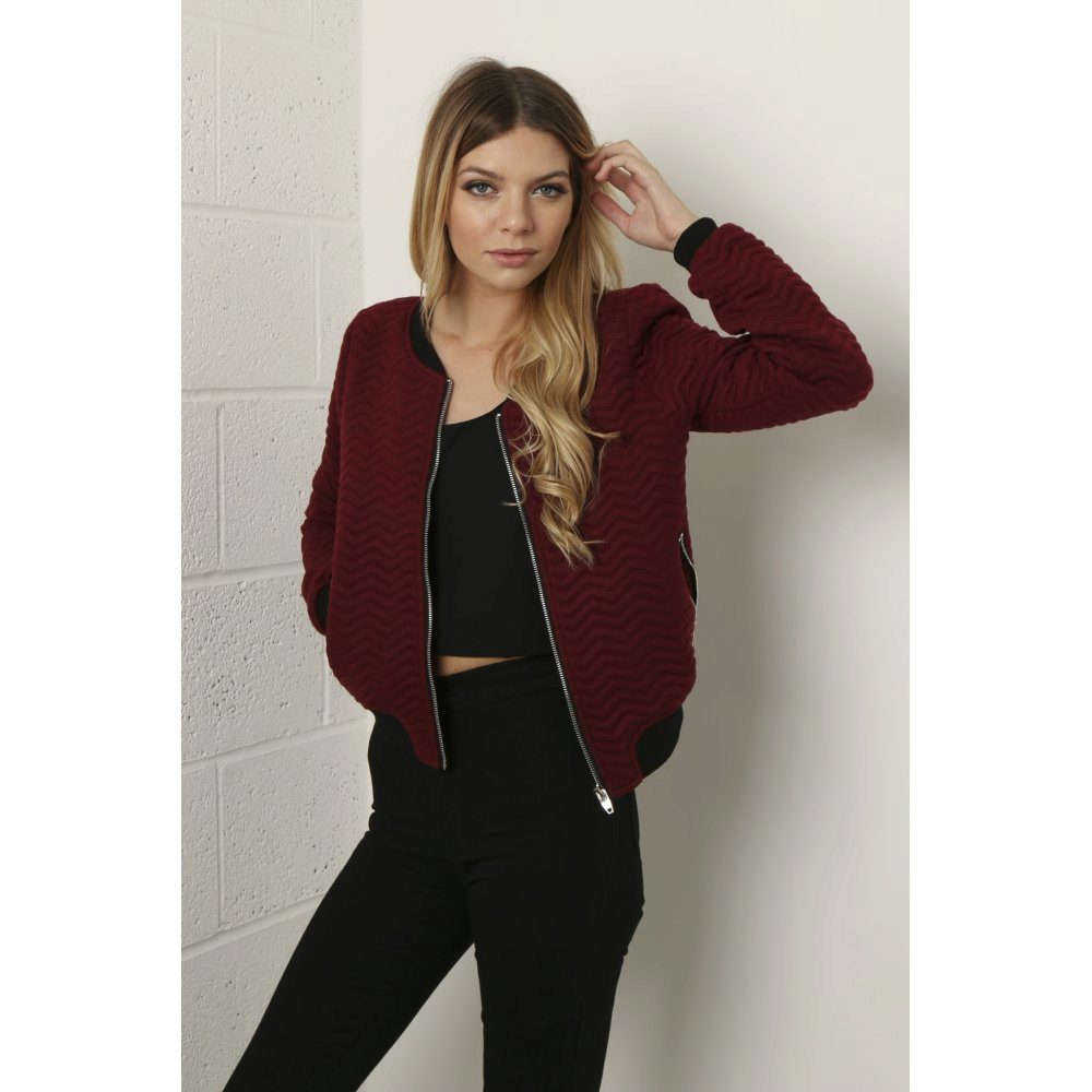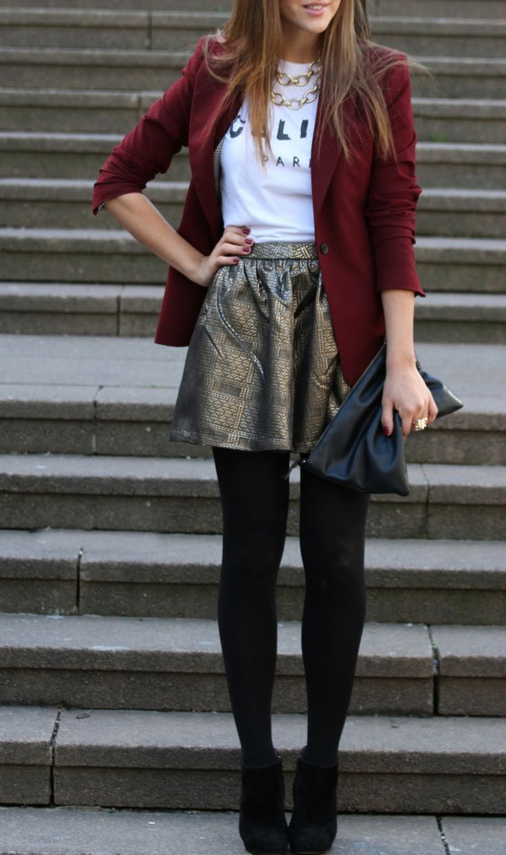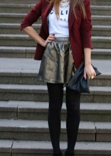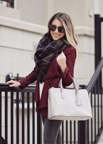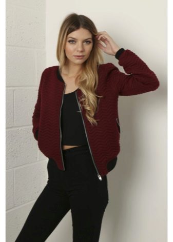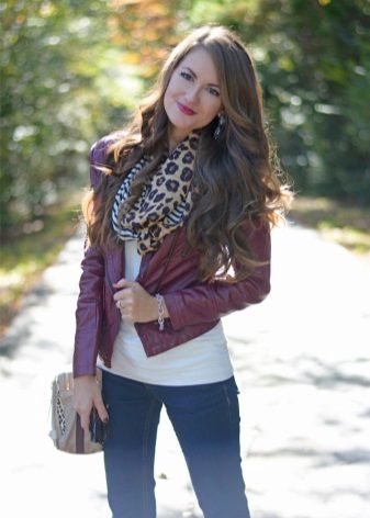 In combination with various dresses the shortened light jacket of claret color will look very well. Since the waist will be open, the dress should be chosen by a fitting style to emphasize the dignity of the figure. We recommend that you wear black high-heeled shoes or choose other shoes to match your jacket. The final accent of the image can be made of a wide scarf of thin fabric in the color of wet foliage, which will add an image of refinement and unusualness.