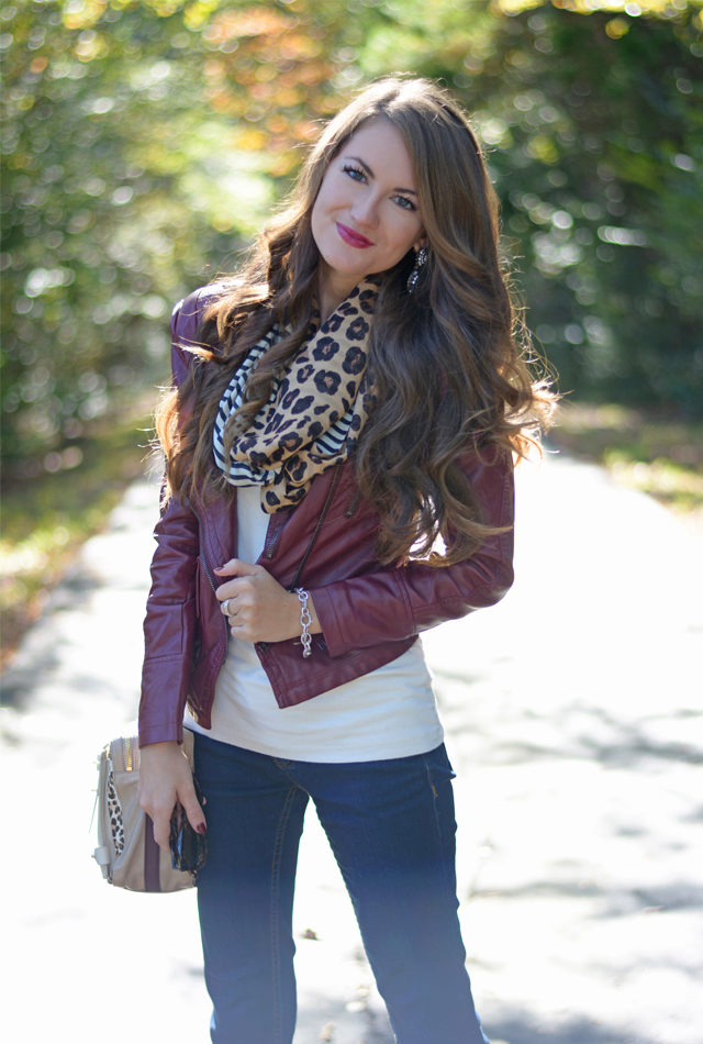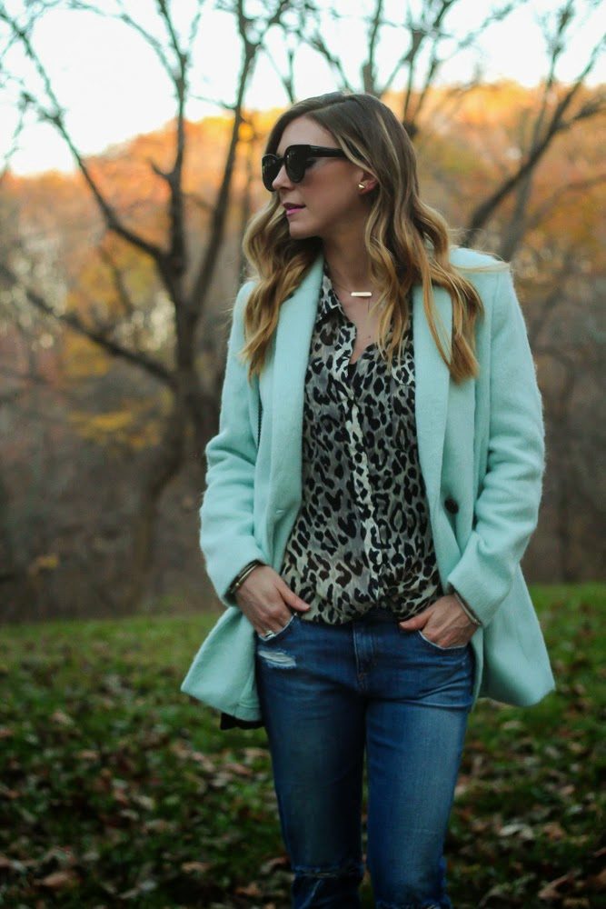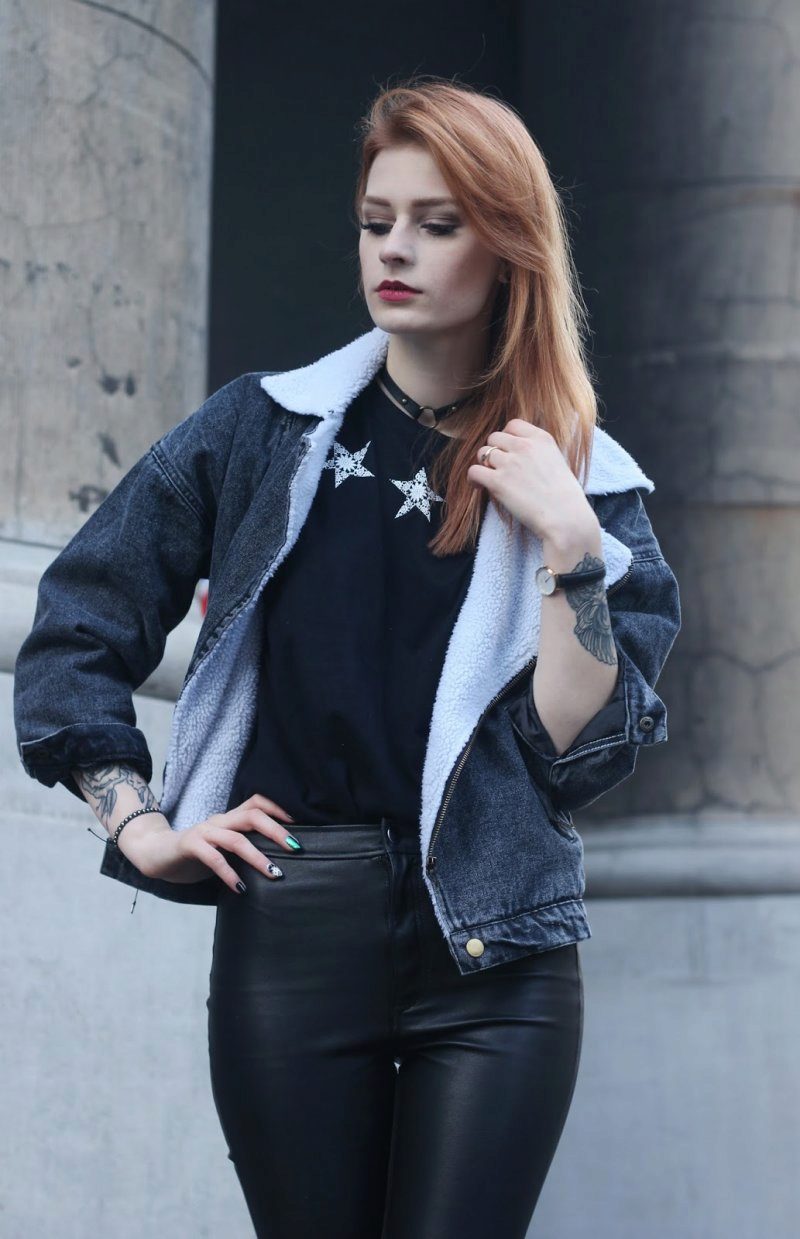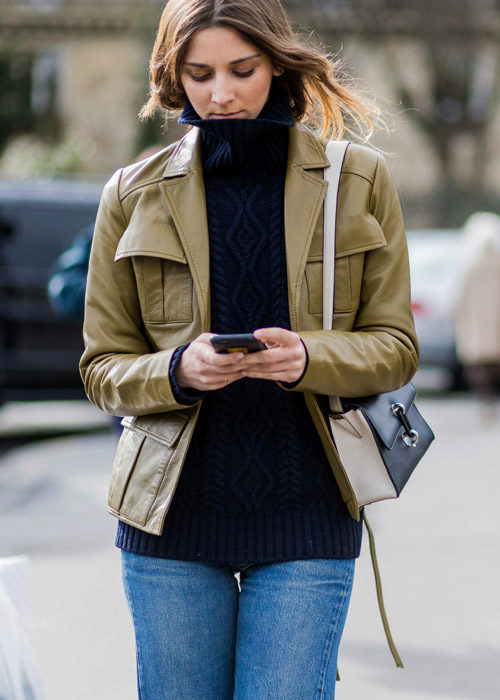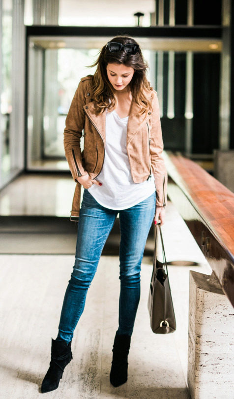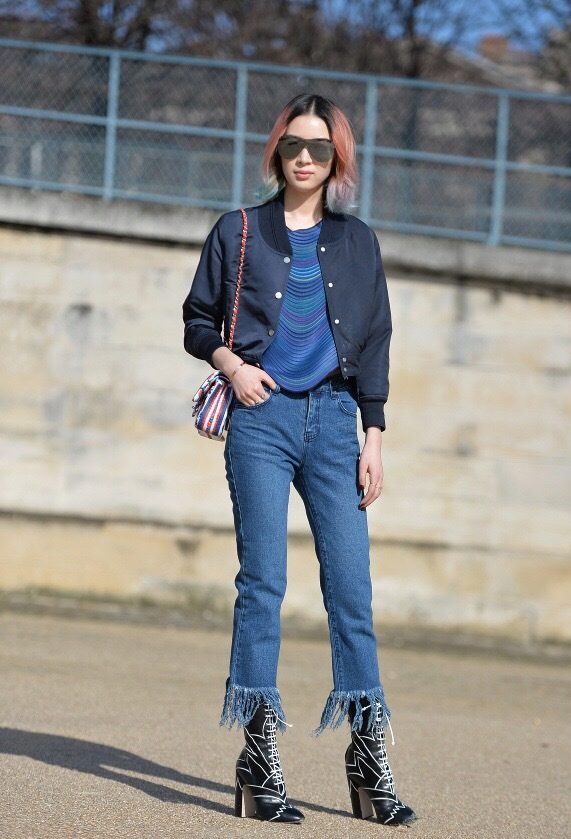 For a casual spring look, you can wear a blue leather bomber jacket, combined with jeans or dark skinny pants.