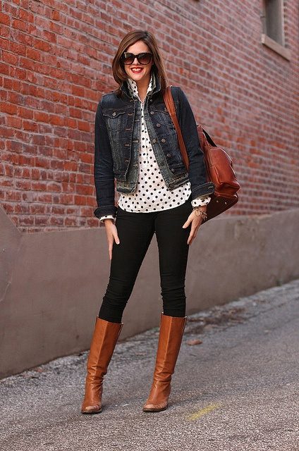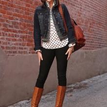 Warm black denim jackets are also noteworthy. By adding a bit of fur or padding polyester under the main layer of denim, you can get a raincoat for autumn or a warm winter jacket. The additional detail in the form of a hood trimmed with light fur will “dilute” the black color of the jacket, and the knitted elongated cuffs will not allow your beautiful handles to freeze in extreme cold.