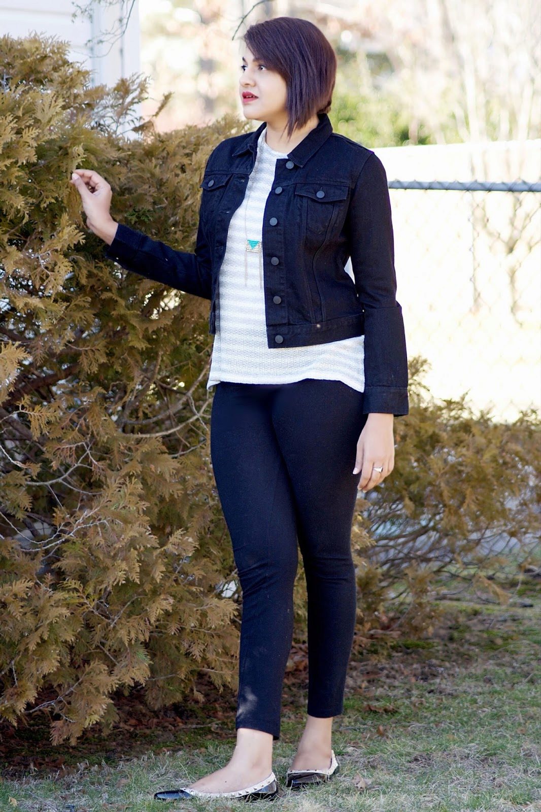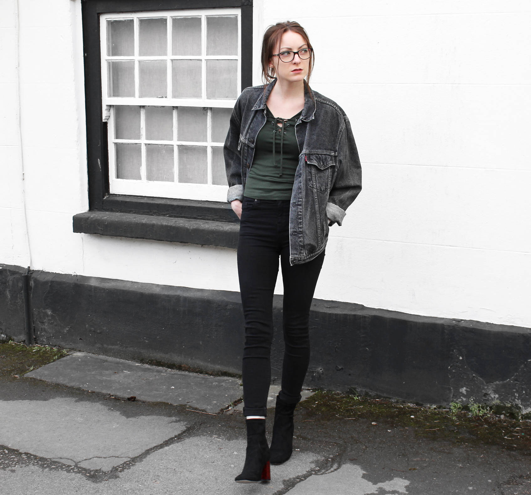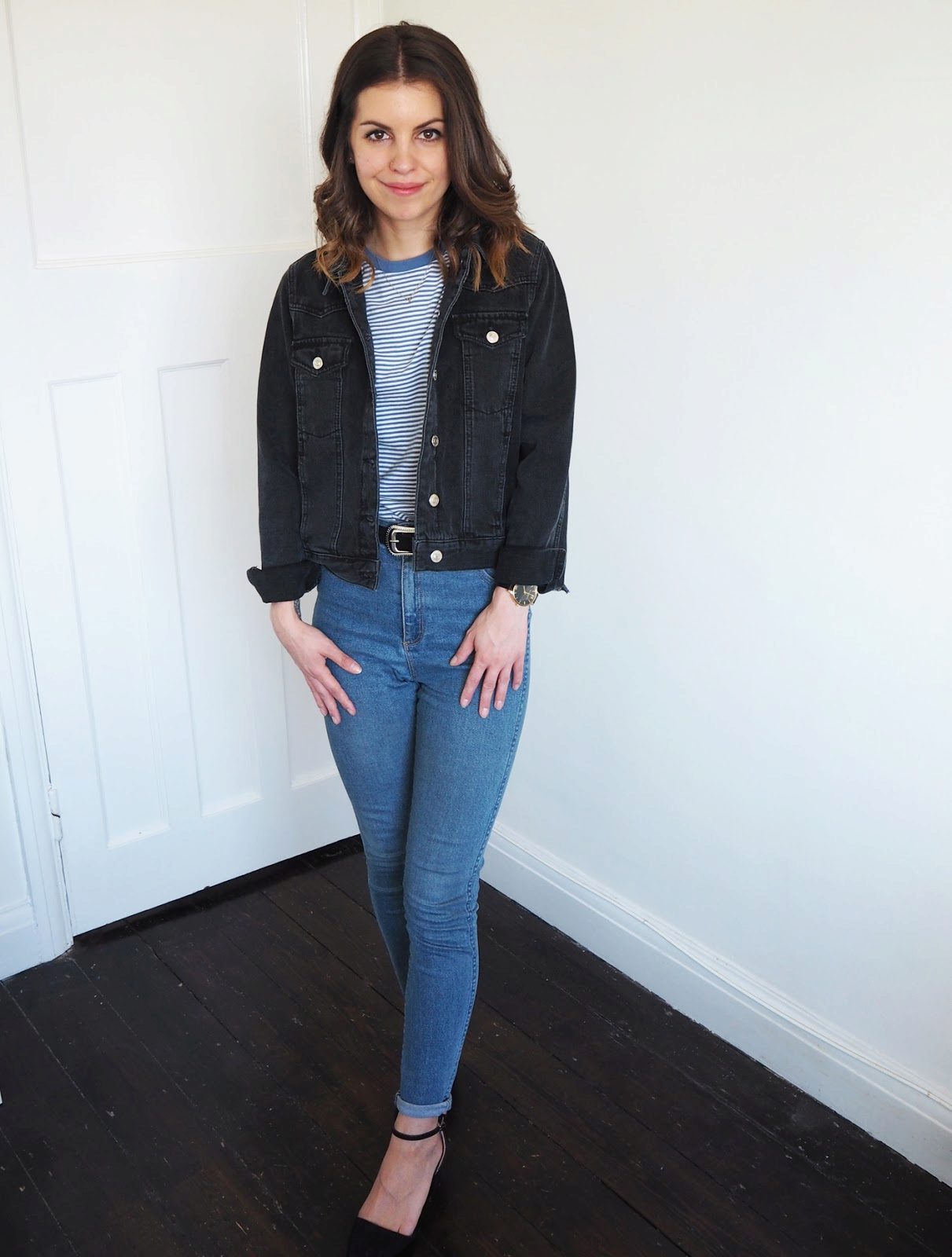 - Black denim jacket sporty + light loose mid-thigh shirt + cropped blue jeans with scuffs + white sneakers
