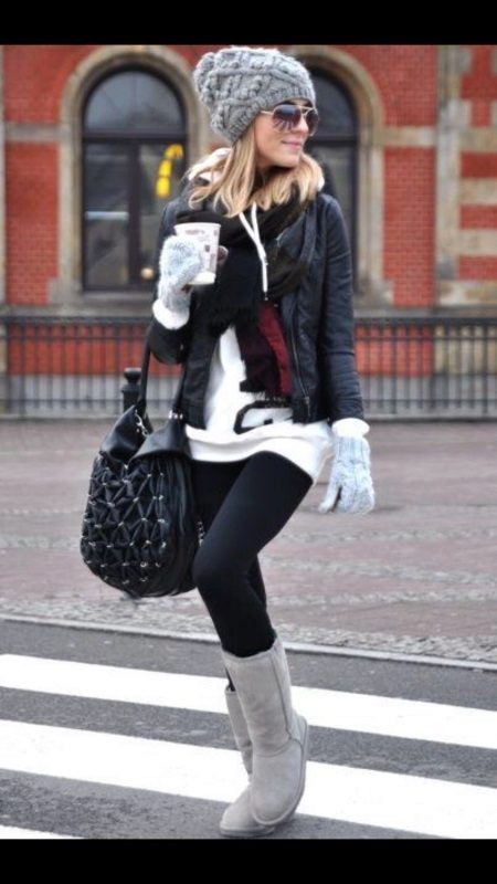 - Warm black denim jacket + white wool tunic + gray hat and natural wool mittens + uggi in tone hat to mid-calf.