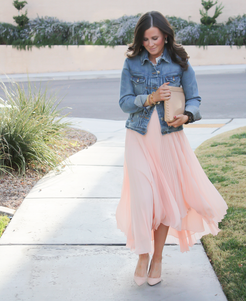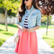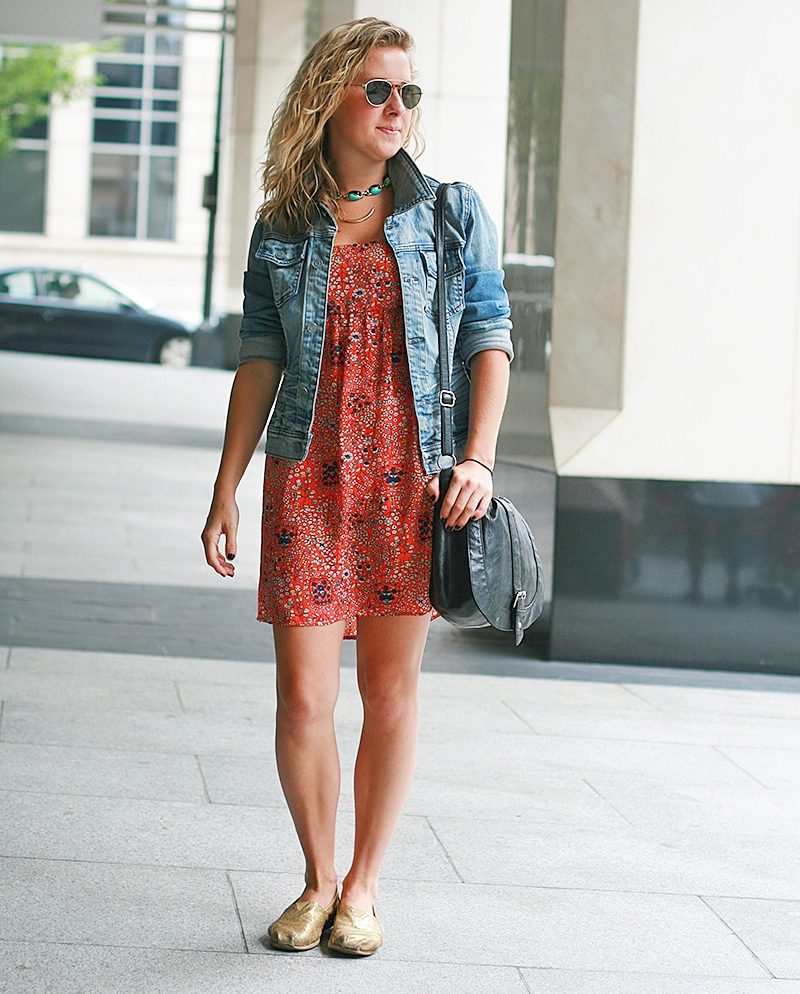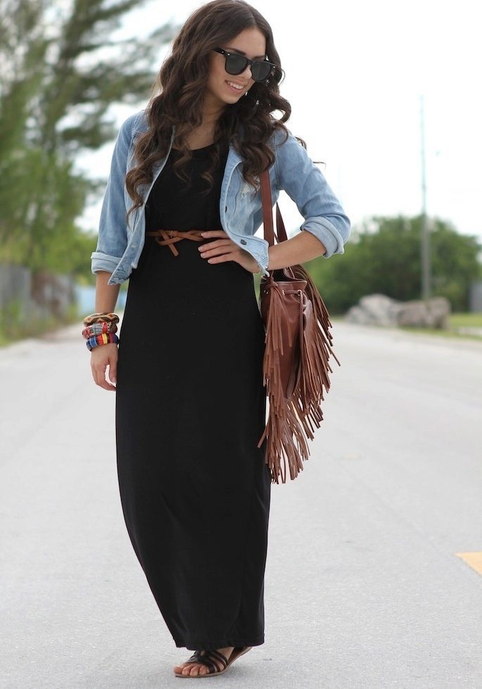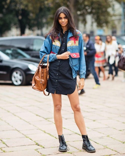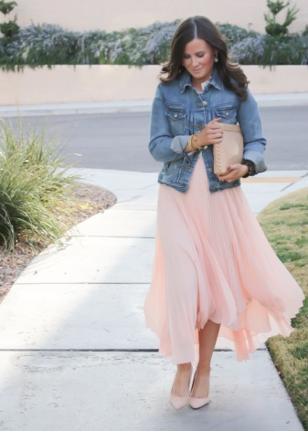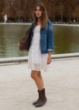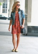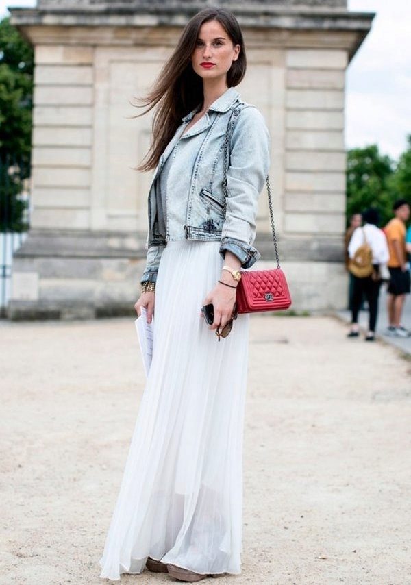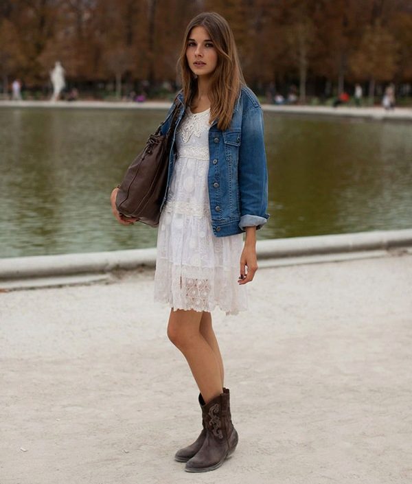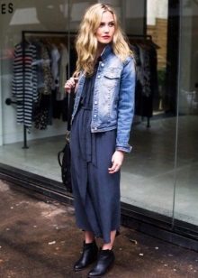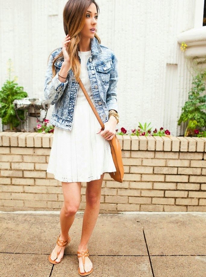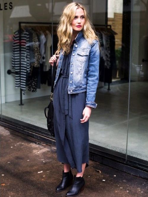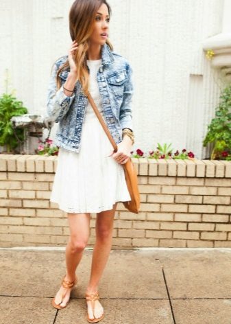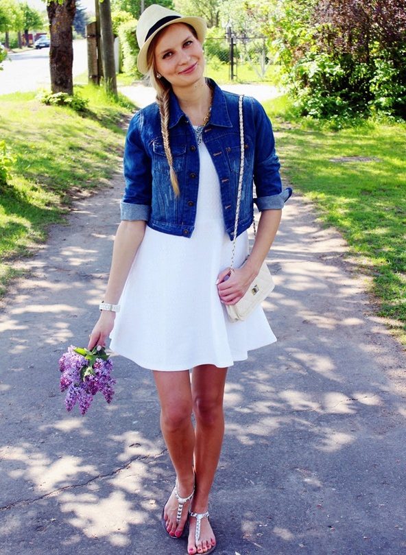 Denim jacket blends perfectly with summer light dresses, creating a feminine, fashionable bow. Designers offer to wear a short jacket with silk, linen, chiffon or knitted sundresses.