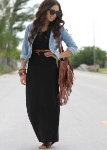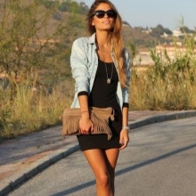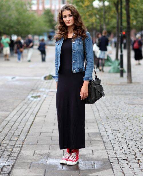 - For a stylish look for every day, a short denim jacket in tandem with a simple black dress on the floor and high red sneakers is suitable. A small handbag to match the dress perfectly complements the casual bow.
