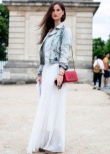 - The cropped jacket can be combined with a long pleated white skirt to the floor. A small red handbag will be a bright accent. This bow is suitable for a party or meeting with friends.