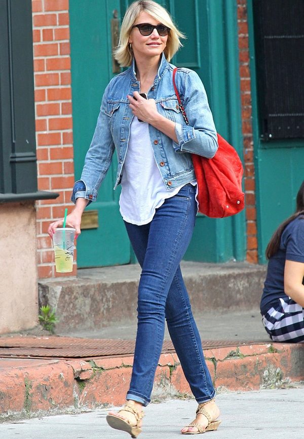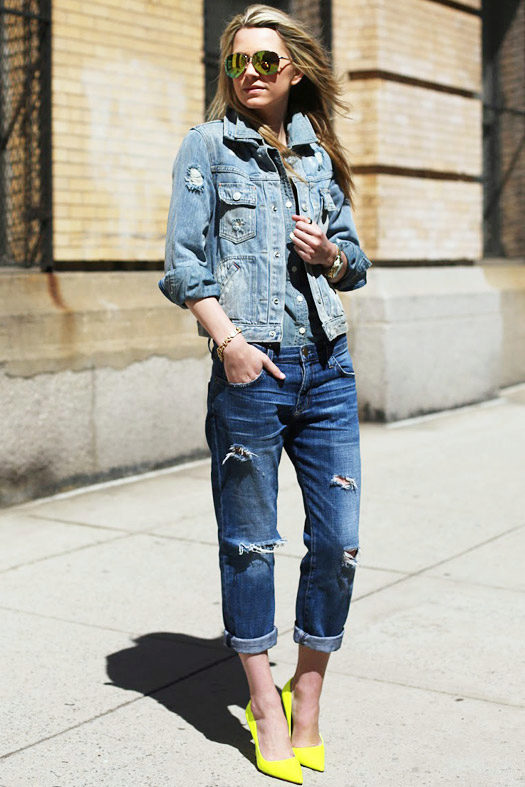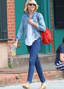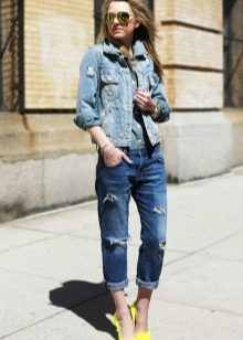 - The combination of jeans, a shirt and a jacket from a denim of different color looks very impressive. Graceful sandals or shoes with low heels will give the image of elegance and femininity.