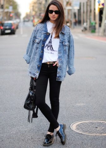 Many girls like to wear short jeans with a plain T-shirt and black pants. This image looks both simple and elegant. A T-shirt or T-shirt can be a bright accent in creating a bow. Stylists offer to wear models decorated with bows, rhinestones or lace. A jacket with minimal decor will look harmonious with this t-shirt.