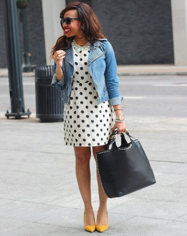 - To create a romantic image, you should wear a short dress in peas, and the main role is played by contrast. A blue cropped jacket will complement a stylish bow, and yellow slippers will be a bright accent.