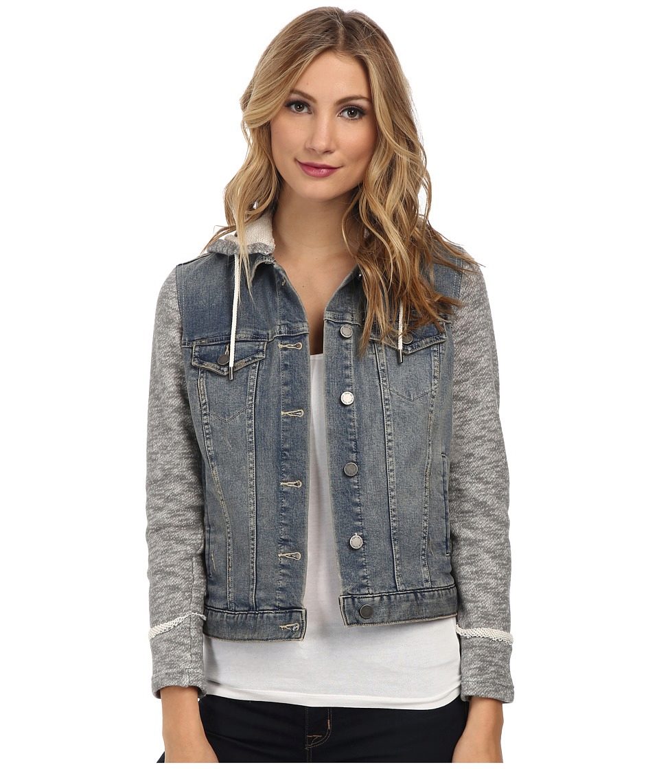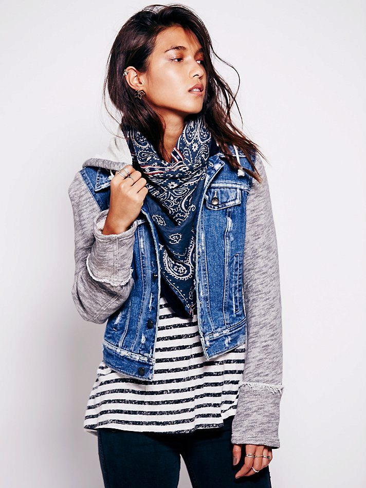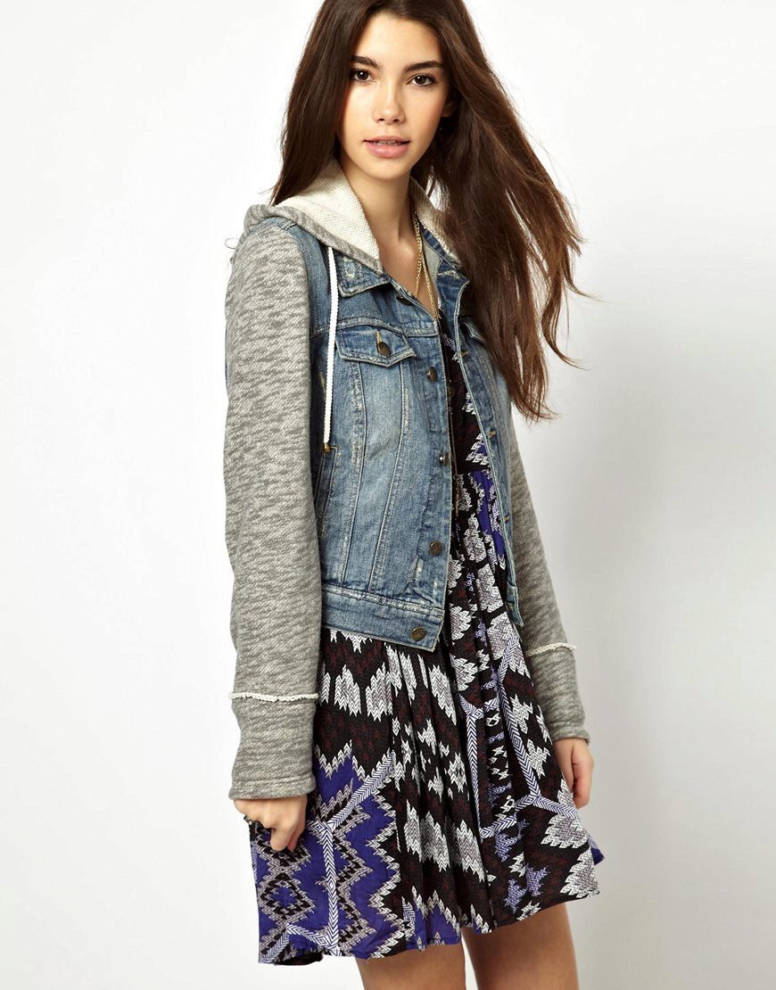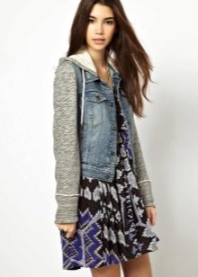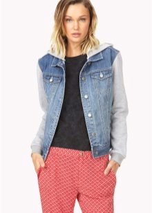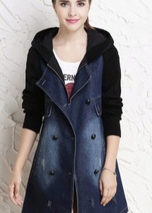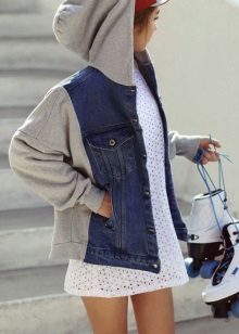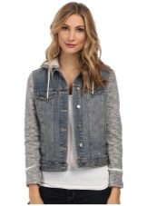 - Combined model. An interesting option for those who love a variety of textures. The jacket can be made in classic, biker, or any other style. Its main feature is a non-denim hood. As a rule, tight knitwear is used. Typically, these models have a detachable lining, which is directly attached to the hood. He can be free or on the draw-on lace-up. The advantage of such a jacket is that the hood can always be removed if necessary. For example, when the jacket is worn under a fur coat or a down jacket.