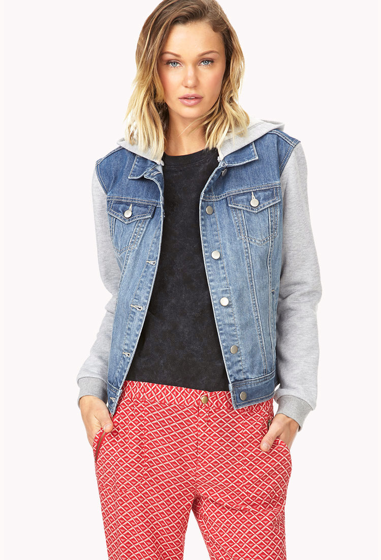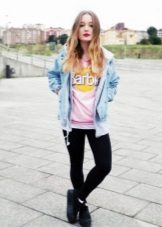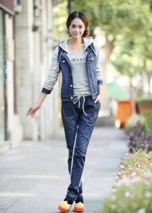 A denim jacket with a hood very well, it will look with skinny pants or jeans in a contrasting color. If you want to create a bold and bold image, we recommend to wear jeans with leather trousers.And if you prefer tenderness and grace in appearance, then you will not find a better combination than with pastel-colored jeans.