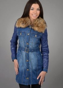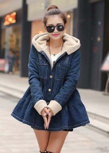 Hooded denim jacket with fur trim is perfect for those who appreciate comfort, practicality and beauty at the same time. The model can be made not only from denim, but combined with some other material, such as chamois or corduroy.