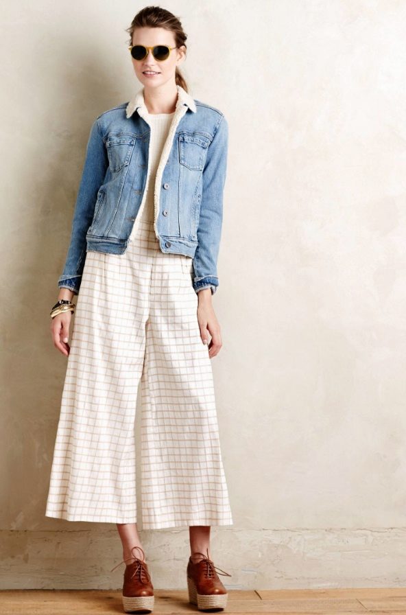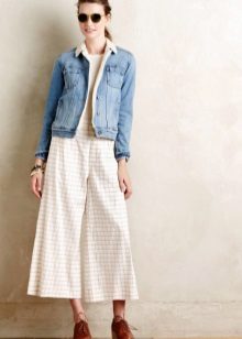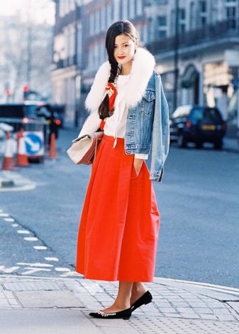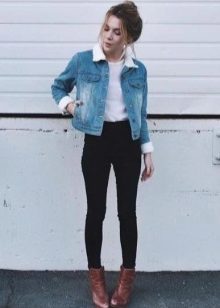 A denim jacket with additional warming will be the perfect option for a combination with pants made of thick or coarse mono-color material. It is not recommended to only wear it with jeans of the same color, so as not to appear dressed in a denim suit.