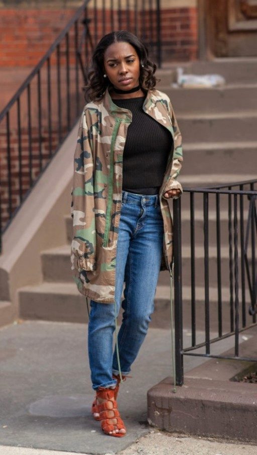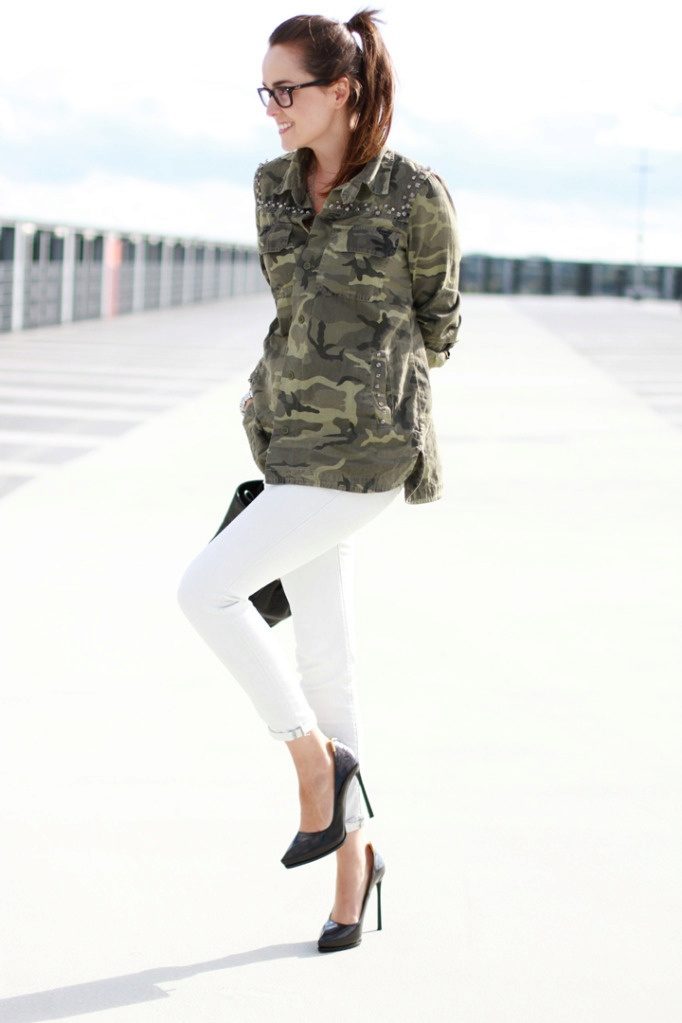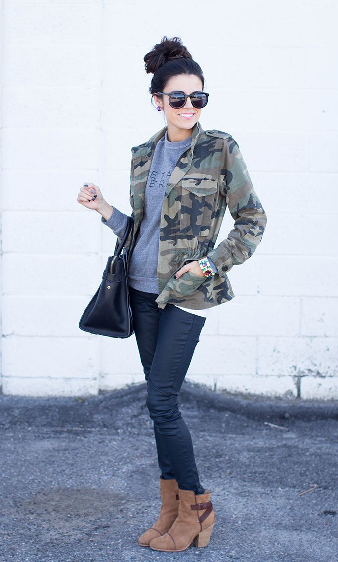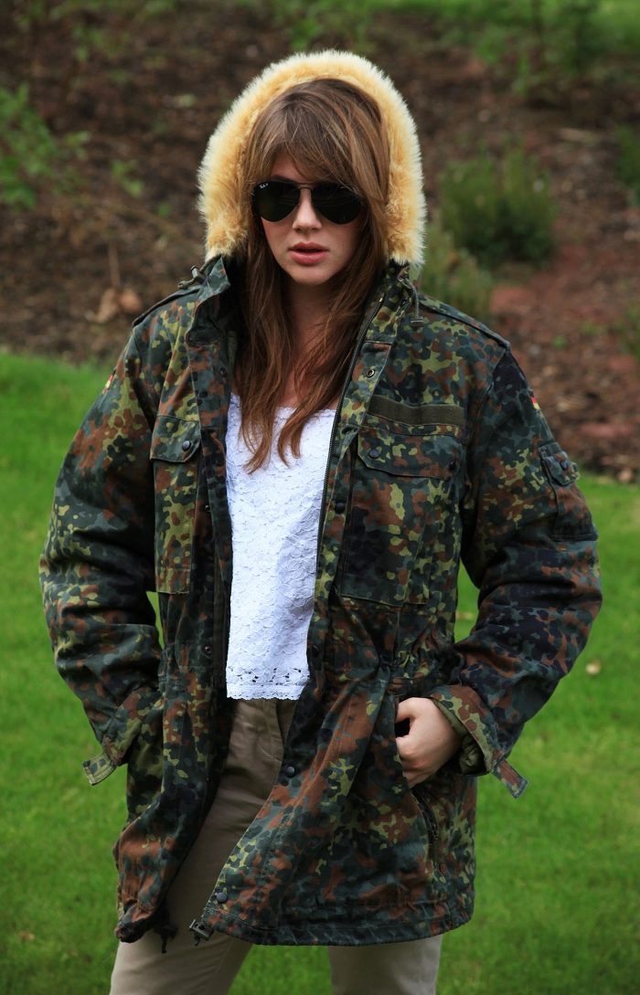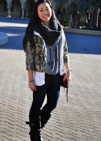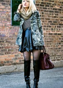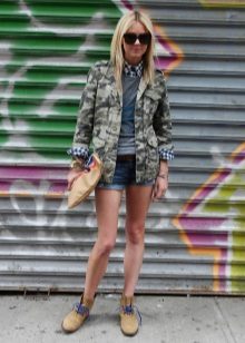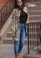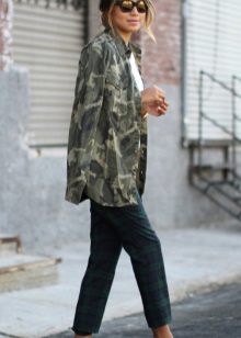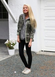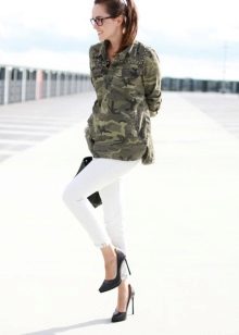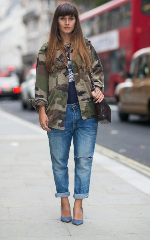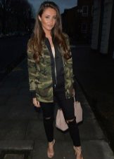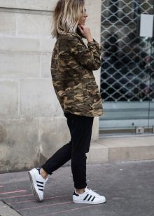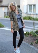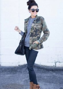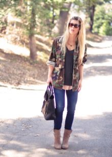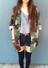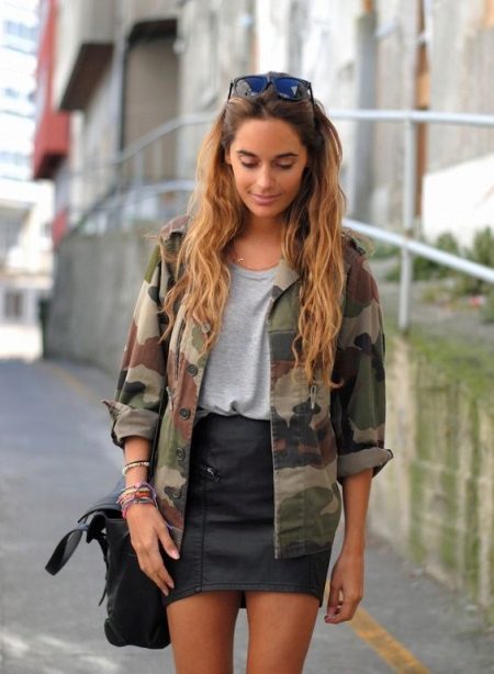 An excellent tandem camouflage jacket with worn or torn models. Trousers in military style will be a good complement. When choosing a top for a camouflage jacket, you should prefer t-shirts or sweatshirts.