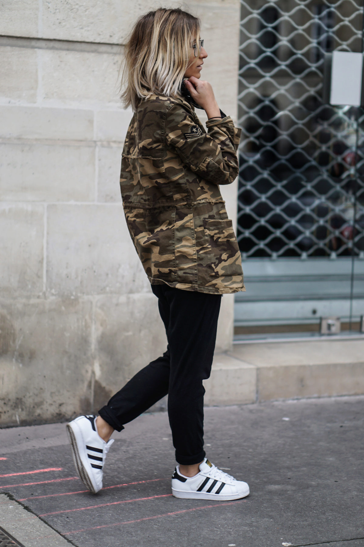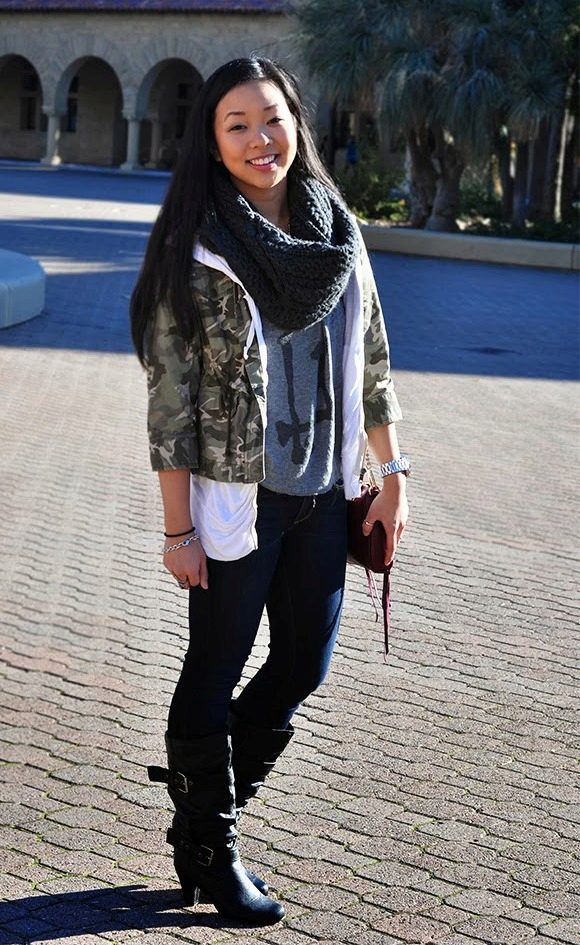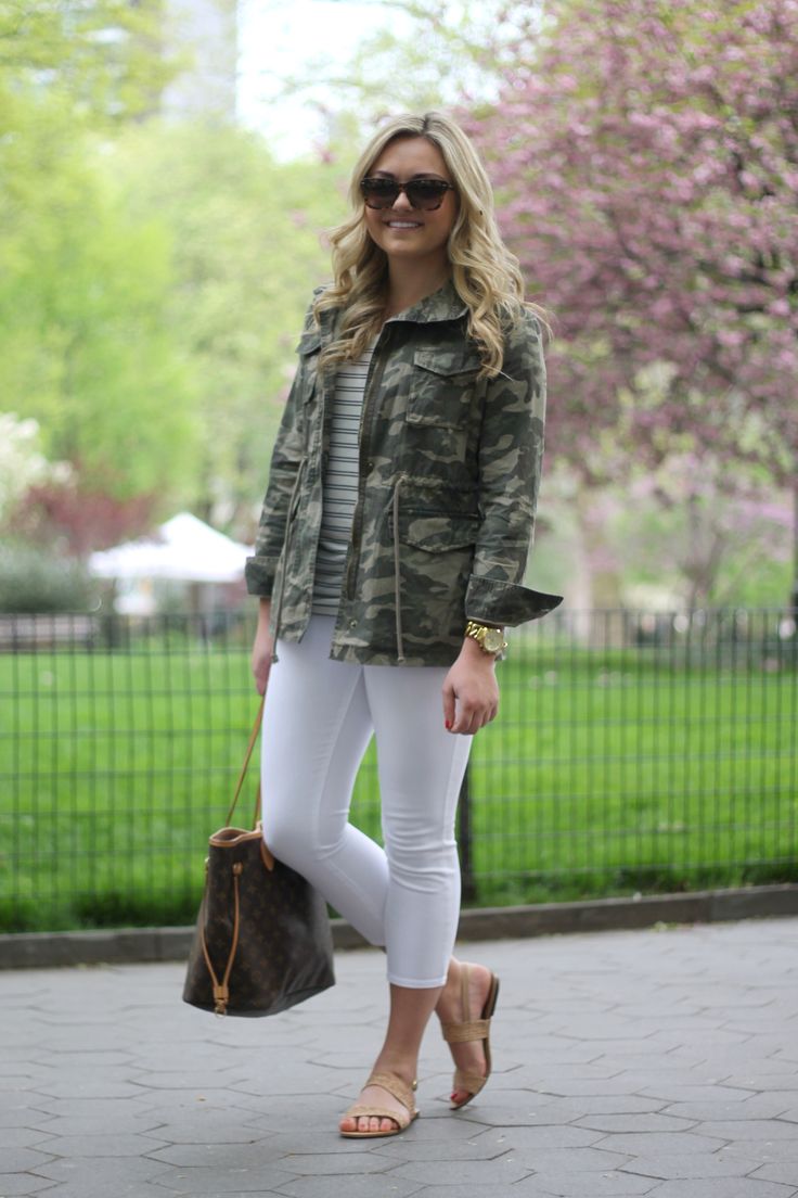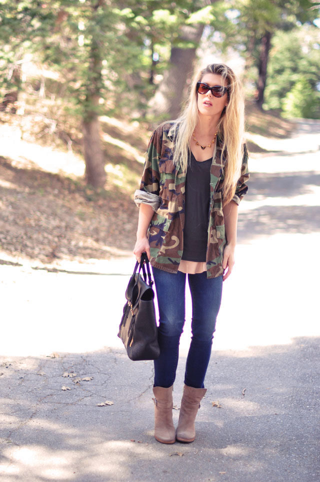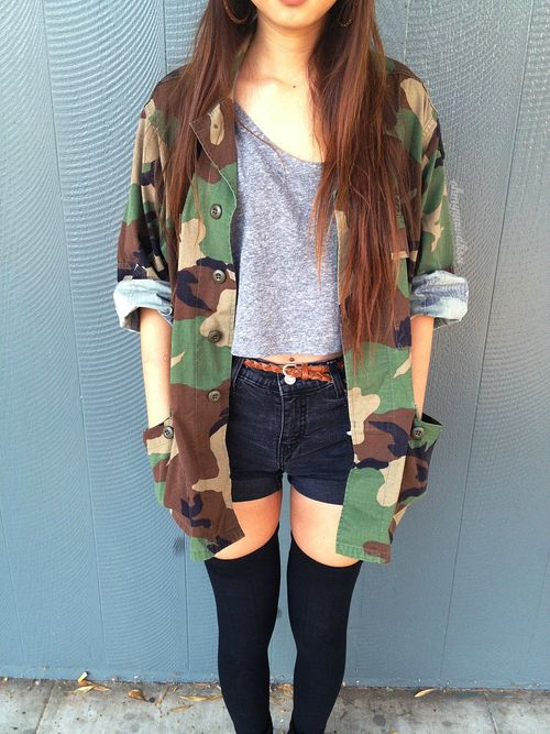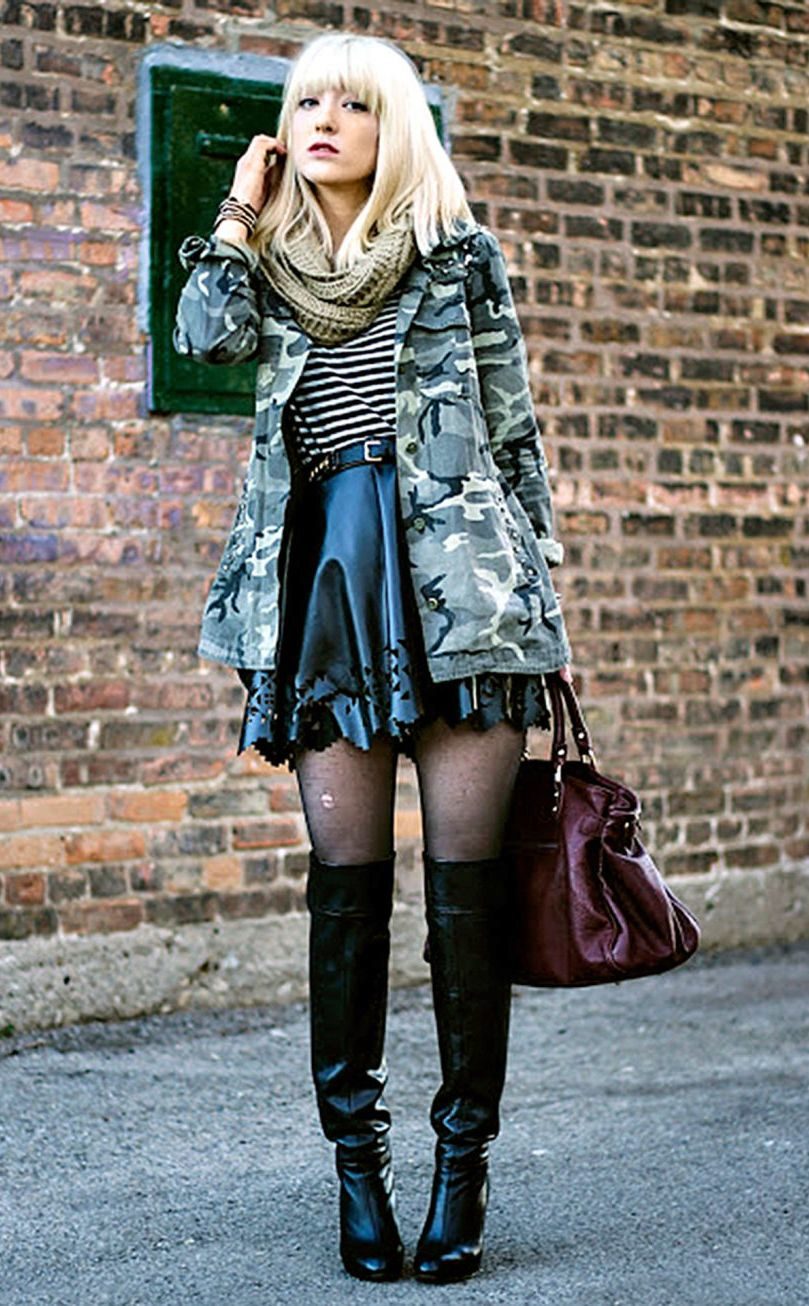 An excellent tandem camouflage jacket with worn or torn models. Trousers in military style will be a good complement. When choosing a top for a camouflage jacket, you should prefer t-shirts or sweatshirts.
