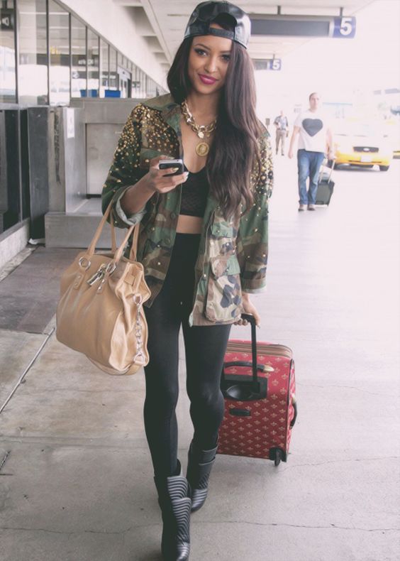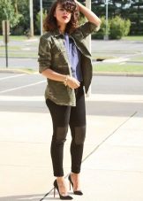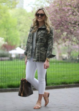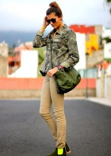 For example, an ensemble of golden bra, tight-fitting military-style jeans with a shorter camouflage jacket will help create an unforgettable, sexy and trendy bow. Outerwear in military style (sports windbreaker or long down jacket) has always adorned the woman, helping to open her appeal.