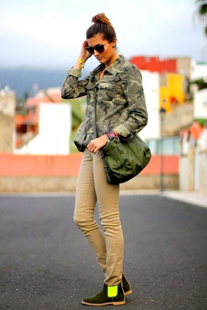 A wrist watch will become a beautiful accessory in military style. Many fashionable women choose khaki shoes or handbags.