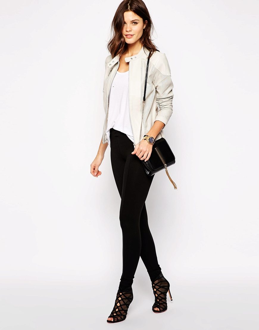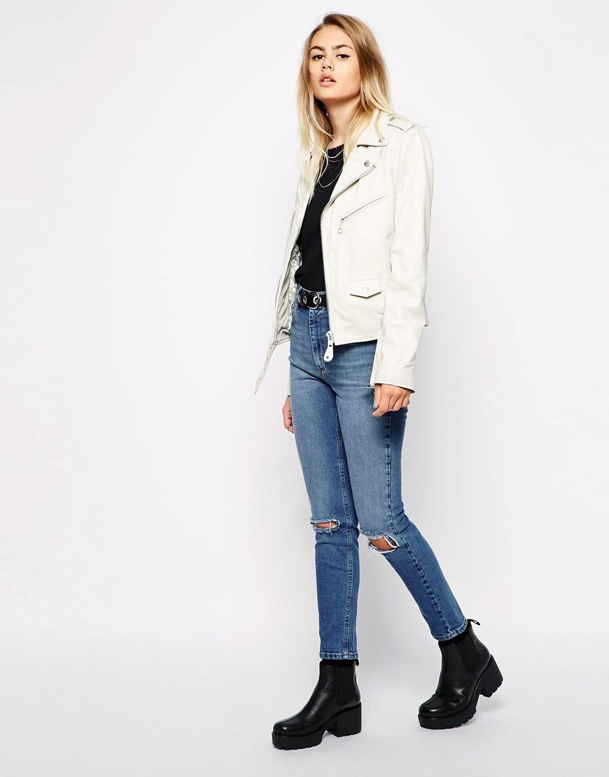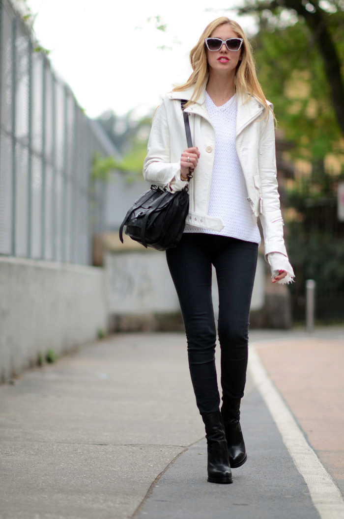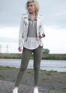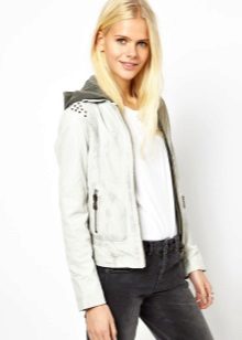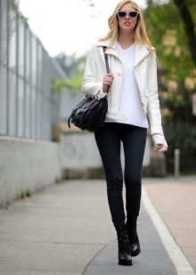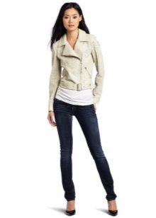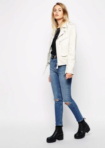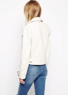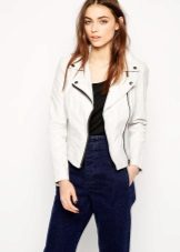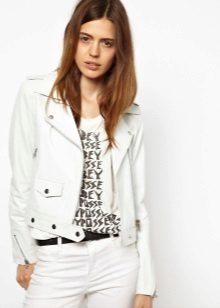 White leather jacket is a universal element of the wardrobe, because it can be worn with things of any color.