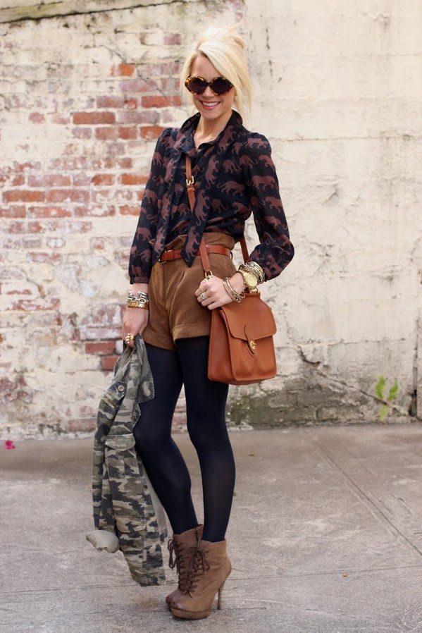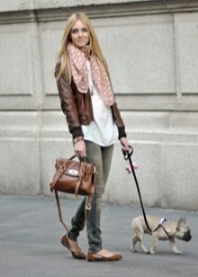 Light brown jacket blends with dark clothes, although you can use things of pastel shades. Even some bright colors will help create a stylish bow.