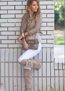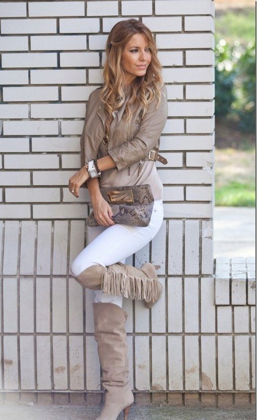 To create a country-style bow, jeans, a snow-white shirt and half boots, extended upwards, are essential elements. If such a bow is already tired, then you can combine a jacket with a suede skirt, wear brown stockings or tights under it.